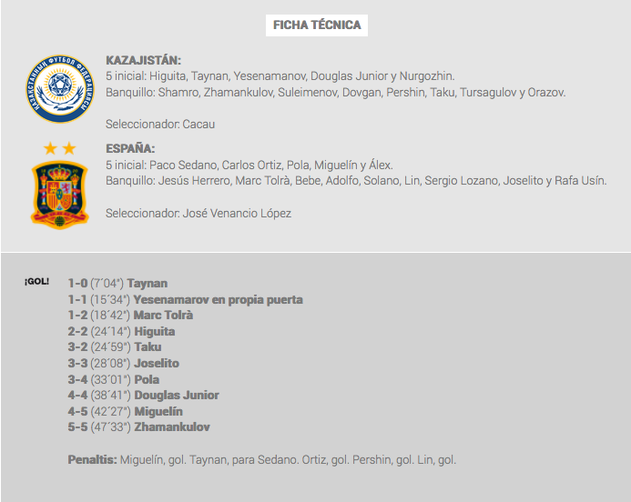 Miguelín, Ortiz y un eléctrico Álex lo intentaban para España con una Kazajistán que renunciaba de inicio a su habitual juego de cinco apoyándose en la versatilidad de su guardameta Higuita -no por casualidad toma ese apodo- para abrir el campo y llegar en un puñado de toques hacia la portería española.