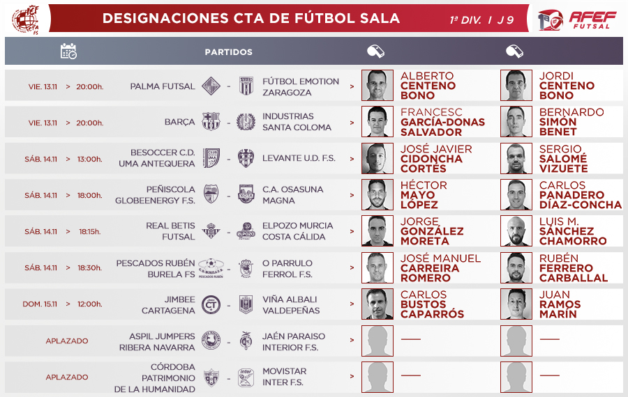ACTUALIDAD | Primera Masculina Futsal 12 Noviembre 2020 DESIGNACIONES | Estos son las árbitros que dirigirán la Jornada 9 en la Primera RFEF Futsal Los encuentros tendrán lugar entre el viernes 13 y el domingo 15 de noviembre
