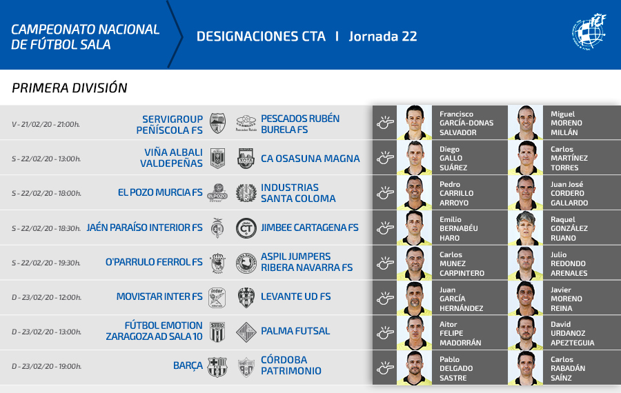 ACTUALIDAD | Primera Masculina Futsal 17 Febrero 2020 Estas son las designaciones de la Jornada 22 del Campeonato Nacional de Fútbol Sala