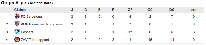 A falta de una jornada para finalizar esta ronda, los dos conjuntos españoles ocupan la primera plaza de sus respectivos grupos al haber ganado los dos choques disputados. El FC Barcelona jugará este sábado 25 de noviembre a las 20:35h. contra el Pescara, el anfitrión del grupo. Por lo que se espera un partido muy intenso con las gradas llenas de aficionados italianos.
