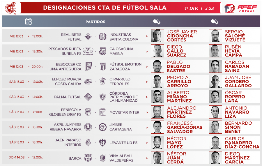 ACTUALIDAD | Primera Masculina Futsal 10 Marzo 2021 OFICIAL | Estos son los horarios y las designaciones para la Jornada 23 en la Primera RFEF Futsal Los nueve encuentros se disputarán entre el viernes 12, el sábado 13 y el domingo 14 de marzo