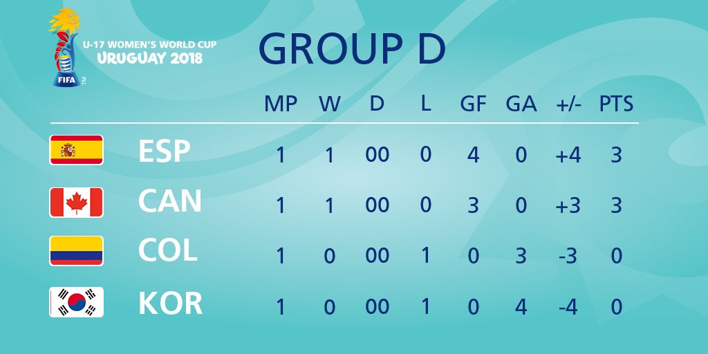 Tras la goleada por cuatro tantos a cero de la Selección española Sub-17 femenina ante Corea, las de Toña Is lideran el grupo junto a Canadá, que se impuso por 3-0 a Colombia en el otro partido del Grupo D