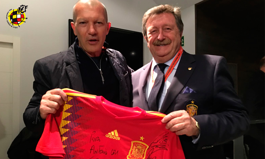 El Presidente de la RFEF, Juan Luis Larrea y la secretaria General, Esther Gascón, dieron la bienvenida a la estrella del cine, orgulloso aficionado de la Selección española que incluso participó, a...
