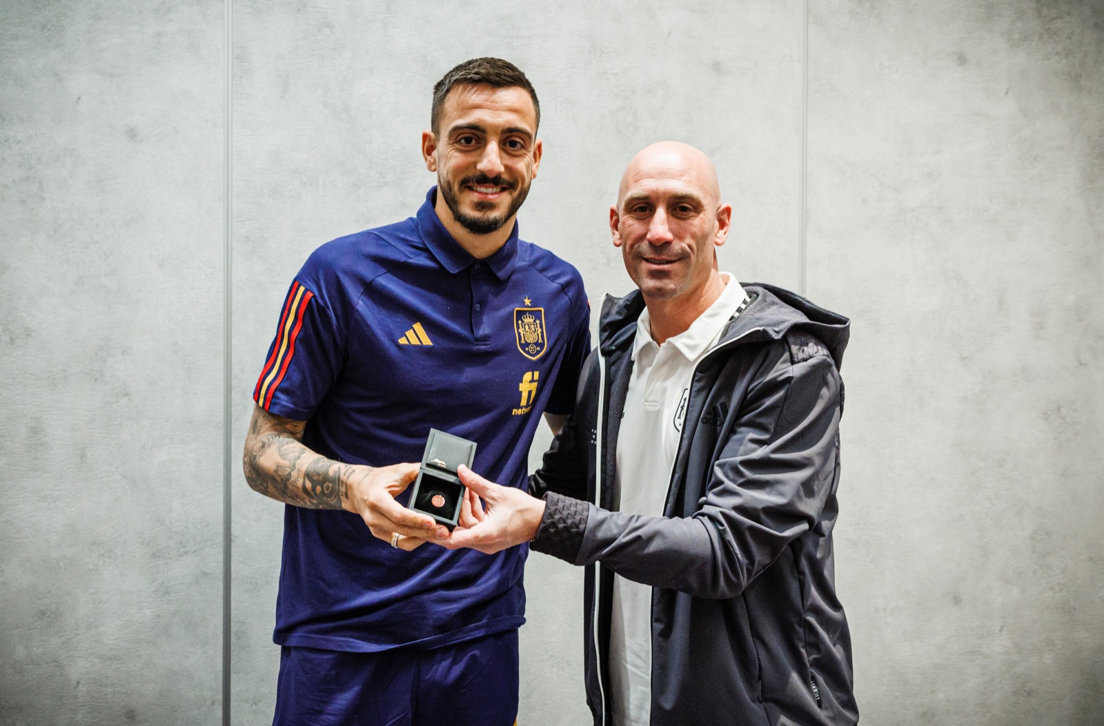 Luis Rubiales entrega a Zubimendi y a Joselu la insignia por debutar con la Selección