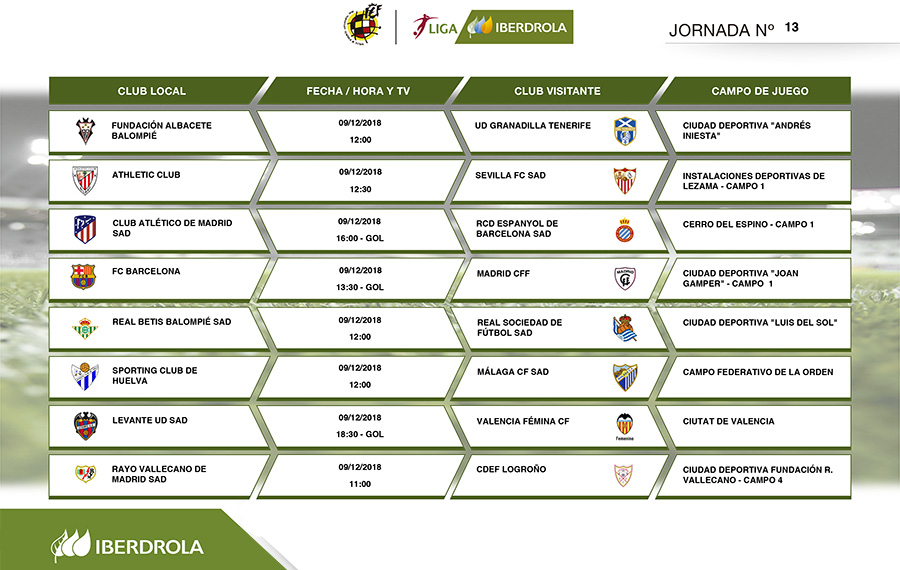 La jornada 13 en Primera División Femenina (Liga Iberdrola) nos trae un domingo de fútbol en directo a través de televisión. No pierdas detalle de los tres choques que podrás seguir en directo