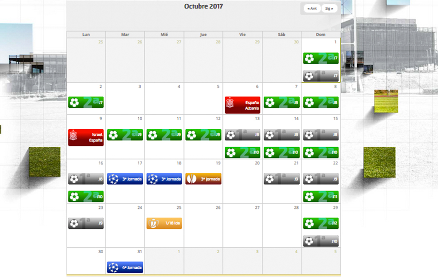 Es el segundo mes de competición oficial de la temporada 2017/2018 y llega con un calendario más que completo. Además de las competiciones de la Selección española de fútbol en sus distintas citas internacionales, se juega el Campeonato Nacional de Liga, y además la Champions y la Europa League, así como el Campeonato de España/ Copa de SM el Rey. No te pierdas nada y consulta nuestro calendario de competiciones: