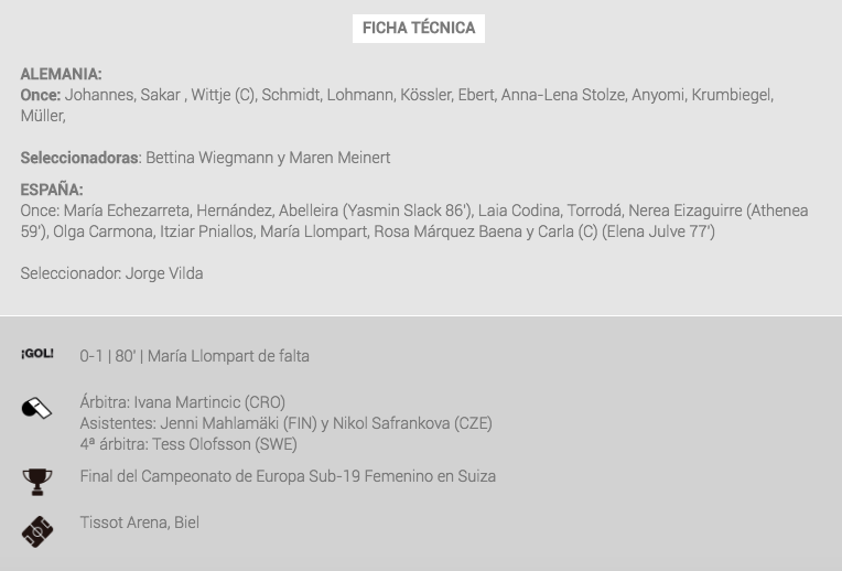 Por fin, por medio de una falta, María Llompart marcó para España (80'), un gol que valía un Europeo. Limpio y claro, el disparo llegó al fondo de las mallas de Johannes, distanciando a la Selección de Alemania y acercando a España al título.