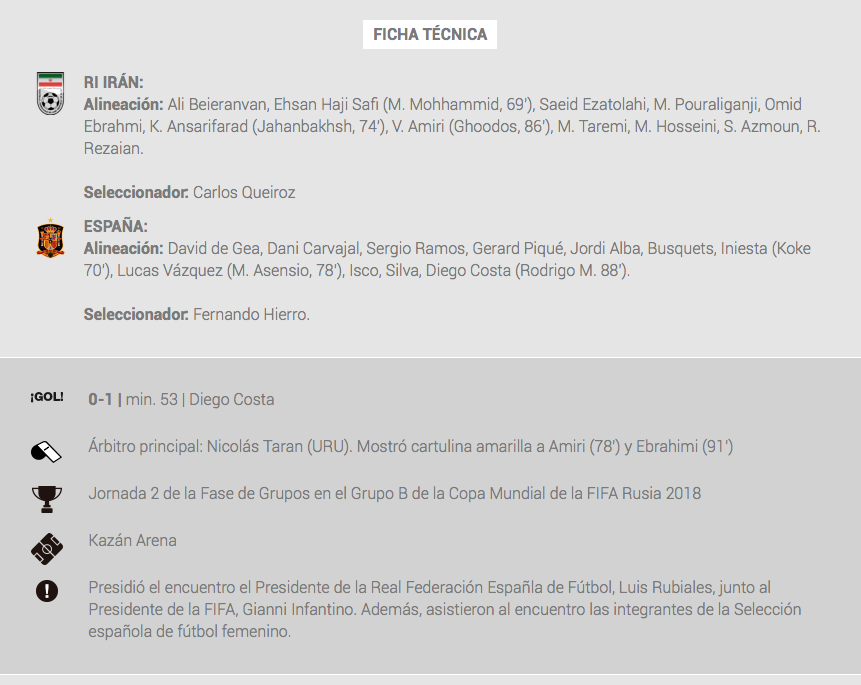 Lo intentó España a balón parado, con Ramos y Silva. Lo probó de nuevo el canario, que tuvo las mejores opciones de remate tras desmarque por el centro de la zaga rival. Hasta que a diez minutos del descanso se trabó el juego, surgieron lesiones y pequeñas molestias en el rival que obligaban a parar el ritmo de juego español. En la prolongación tuvo David Silva su mejor opción para mirar a gol pero la nutrida defensa iraní abortó el remate.