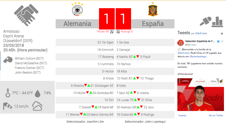 El partido tuvo su aquel para España como era de esperar. A los 23’ pudo empatarlo Timo Werner con un disparo cruzado que rozó el poste izquierdo del portal defendido por De Gea, primera de las ocasiones alemanas del encuentro y fruto, naturalmente, del talento que no se debe discutir al campeón del mundo. Aún lastrados por su inferioridad ante la calidad del toque del medio campo español, deliciosos con frecuencia Iniesta, Isco y Silva, tener enfrente a Khedira, Ozil, Kroos, Müller, Draxler y la “compaña” es como para temer, y con razón, que en cualquier momento hay equipo ahí capaz de causar grandes problemas. Ocurrió, sin embargo, que España jugó bien frecuentemente, con el tiki que se le conoce en no pocos instantes y de ensueño en algunos instantes, que dejaron boquiabiertos a los espectadores. Me refiero a los germanos, claro está. Un chutazo inesperado de Thomas Müller, con mucho espacio libre alrededor, lo aprovechó, no obstante, Alemania para empatar cuando no había atisbo alguno de ello. No fue un gol fruto de su constante presión arriba, sino un chispazo aislado. Un zarpazo. Aceptémoslo: son los que son. Y es bueno no fiarse de ellos. No fiarse nada. Porque cuando menos se piensa…