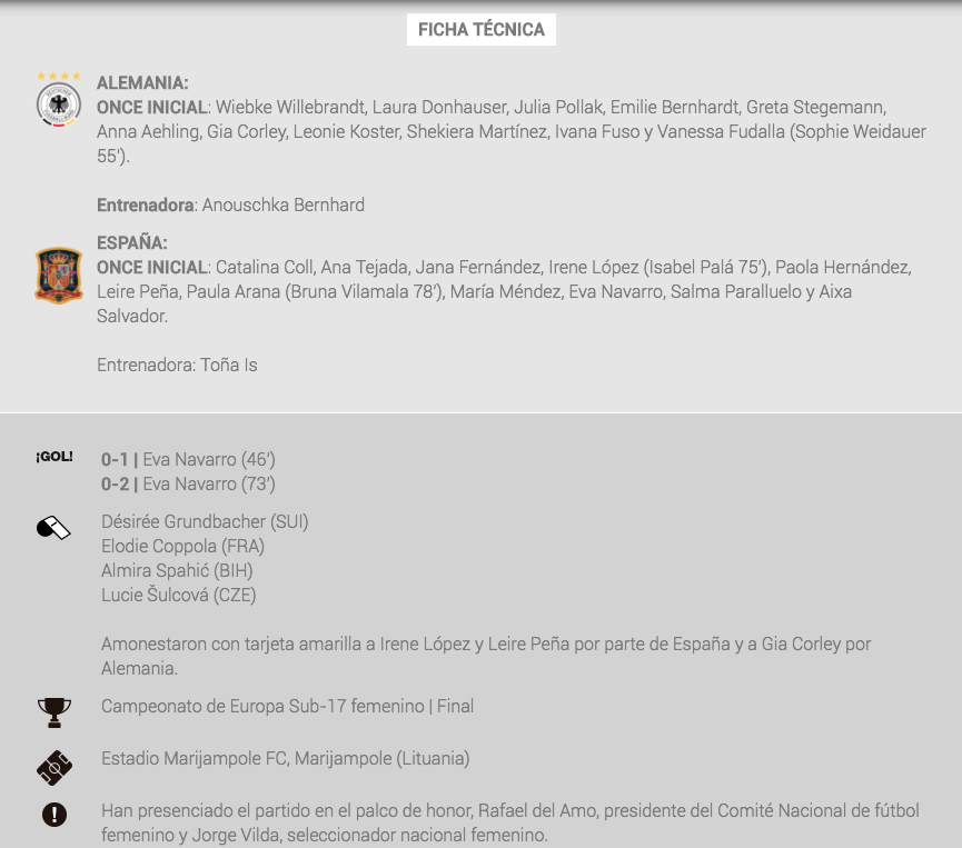 Alemania no pudo reponerse del golpe y el marcador ya no se movió, otorgando a la selección española femenina Sub-17 su cuarto título continental.