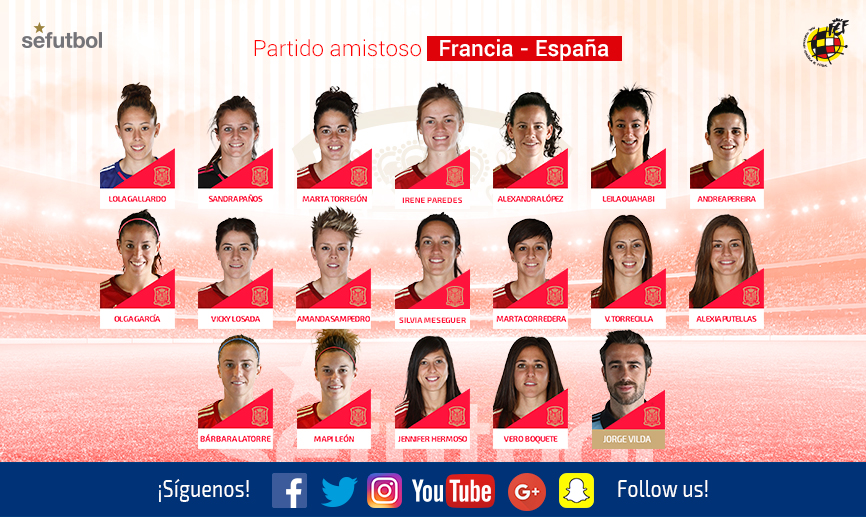 El seleccionador nacional Jorge Vilda ha convocado a 18 internacionales para el encuentro internacional amistoso ante la escuadra francesa el próximo sábado 26 de noviembre a las 21:00 horas.