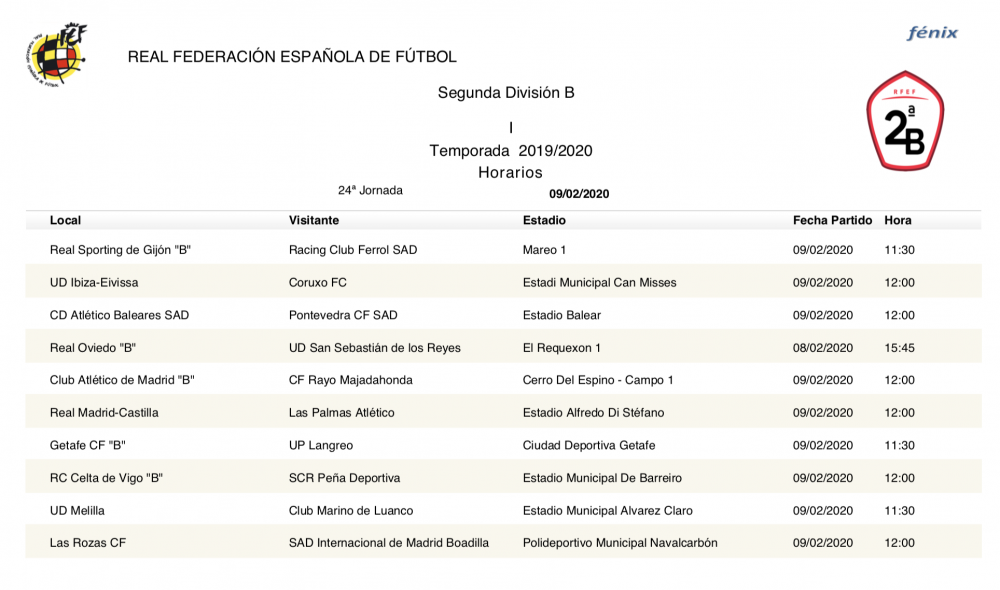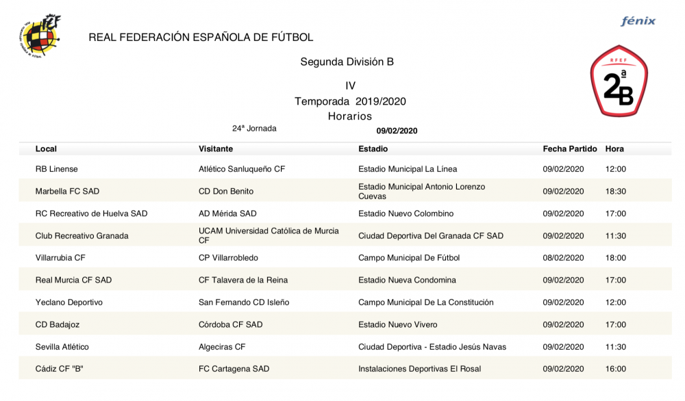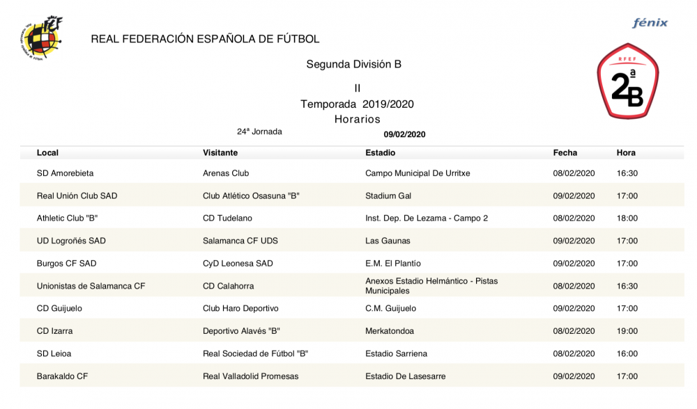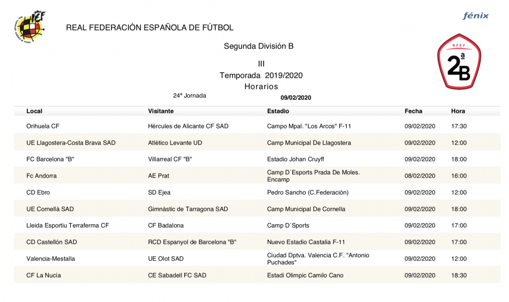 ACTUALIDAD | Competiciones masculinas 04 Febrero 2020 HORARIOS de la 24ª jornada en Segunda División B Todos los partidos se jugarán entre el sábado 8 y el domingo 9 de febrero