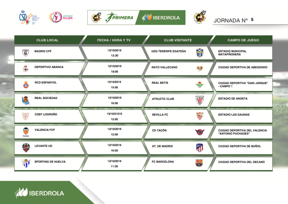 ACTUALIDAD | Competiciones masculinas, Competiciones femeninas 04 Octubre 2019 HORARIOS | Repasa la agenda de partidos de la 5ª jornada en la Primera Iberdrola Todos los encuentros se disputarán entre el sábado 12 y el domingo 13 de octubre