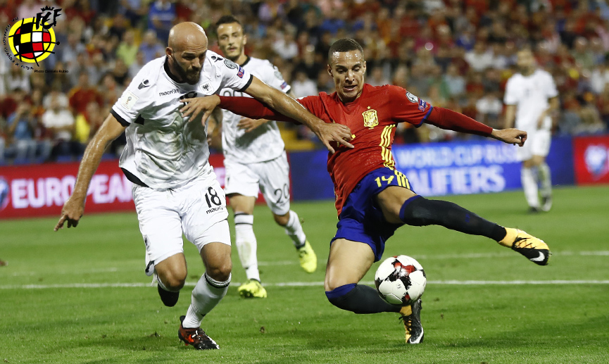 2. Rodrigo recibió el balón y ya tenía el control orientado que necesitaba para marcar el primer gol en la cabeza. El gesto del defensa albanés deja claro que él no se lo podía imaginar