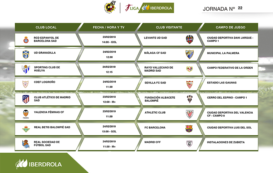 ACTUALIDAD | Competiciones masculinas 18 Febrero 2019 LIGA IBERDROLA | Horarios de la 22ª jornada del campeonato Los partidos se disputarán el 23 y 24 de febrero
