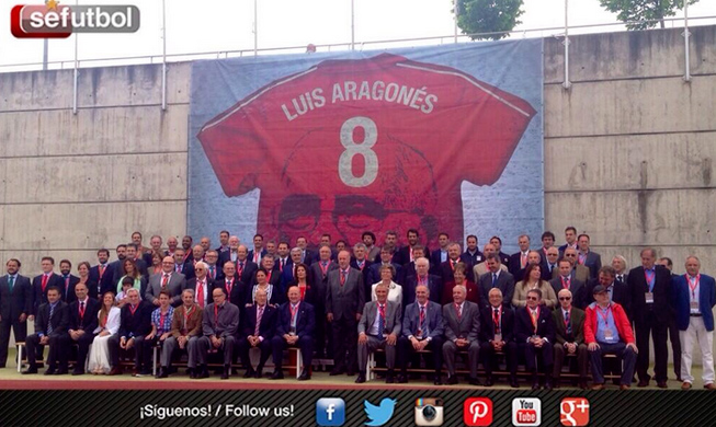 Los internacionales del 64 y de otras épocas también han posado delante de la inmensa camiseta, así como la Junta Directiva de la RFEF.