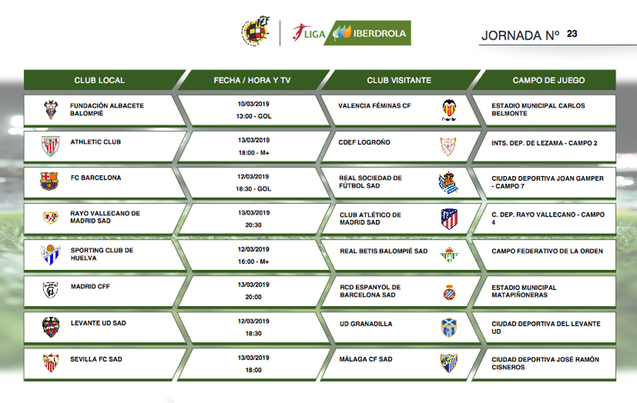 Consulta todos los partidos y los horarios de la Liga Iberdrola, en la tabla a continuación: