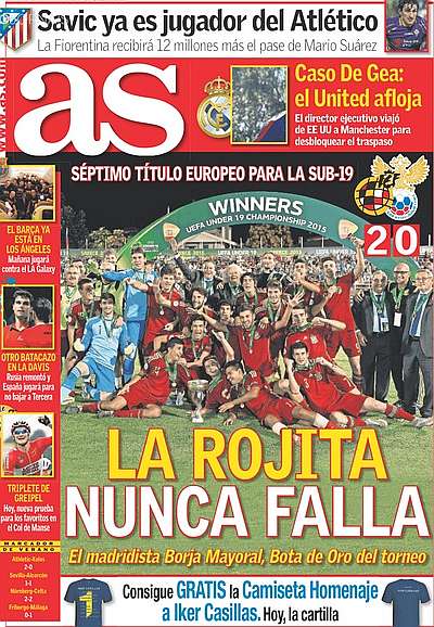 El diario madrileño destaca que "España es campeona de Europa Sub-19 por séptima vez en su historia. Este grupo de amigos, bien dirigidos por un Luis de la Fuente que por su trabajo y dedicación merece este título más que nadie, tocó la gloria una vez más. “Somos lo que repetidamente hacemos. De esta forma, la excelencia no es un hecho aislado, sino un hábito”, sentenció Aristóteles. (...)"
