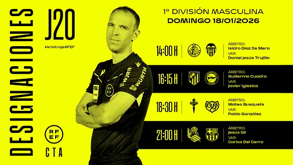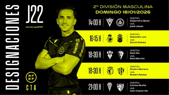Actualidad Inicio Noticias Todas Categorías Institucional Expand Secondary Navigation Menu Presidencia Juntas directivas Igualdad Responsabilidad Social y Sostenibilidad Integridad Protección de la infancia Área médica Elecciones 2024 Federaciones Territoriales FIFA Patrocinadores rfef.es Museo Labor federativa Expand Secondary Navigation Menu Concursos Circulares Horarios Sanciones Mundial 2030 Competiciones masculinas Expand Secondary Navigation Menu Primera División Segunda División Primera Federación Segunda Federación Tercera Federación Copa del Rey Mapfre Supercopa Copa Federación Playoff de ascenso Competiciones UEFA Competiciones femeninas Expand Secondary Navigation Menu Primera División Femenina Primera Federación Iberdrola Segunda Federación FUTFEM Tercera Federación FUTFEM Copa de la Reina Iberdrola Supercopa Iberdrola Juveniles fútbol 11 Expand Secondary Navigation Menu División de Honor Juvenil Copa de Campeones Copa del Rey juvenil Youth League Selecciones autonómicas Expand Secondary Navigation Menu Copa de las Regiones de UEFA Femenino sub-16 Masculino sub-16 Femenino sub-14 Masculino sub-14 Femenino sub-12 Masculino sub-12 Fútbol sala Expand Secondary Navigation Menu Primera Masculina FS Primera FS Iberdrola Segunda Masculina FS Segunda Femenina FS Segunda B FS División de Honor Juvenil FS Copa de España Supercopa FS Supercopa Femenina FS Copa del Rey FS Copa de la Reina FS Copa de España Juvenil Campeonato de España Juvenil FS Futsal UEFA Champions League Selecciones autonómicas FS Otras competiciones Fútbol playa Expand Secondary Navigation Menu Primera División Playa Masc Segunda División Playa Masc Primera División Playa Fem Segunda División Playa Fem Copa Federación Playa Supercopa Playa Selecciones autonómicas Playa Campeonatos Clubes Base Playa Selecciones Playa adaptado Grassroots Expand Secondary Navigation Menu Playmakers Árbitros Expand Secondary Navigation Menu Designaciones VAR Expand Secondary Navigation Menu Audios VAR Entrenadores Expand Secondary Navigation Menu Premios Técnicos por el mundo Cursos Formación Expand Secondary Navigation Menu Formación online Formación presencial Selección Absoluta Selecciones Masculinas Expand Secondary Navigation Menu Sub-21 Sub-20 Sub-19 Sub-18 Sub-17 Sub-16 Sub-15 Sub-14 Selección Absoluta Femenina Selecciones Femeninas Expand Secondary Navigation Menu Sub-23 Sub-20 Femenina Sub-19 Femenina Sub-17 Femenina Sub-18 Femenina Sub-16 Femenina Sub-15 Femenina Sub-14 Femenina Selección Olímpica Expand Secondary Navigation Menu Selección Olímpica femenina Selección Olímpica masculina Selecciones fútbol sala masculinas Expand Secondary Navigation Menu Selección Absoluta fútbol sala Sub-23 fútbol sala Sub-21 fútbol sala Sub-18 fútbol sala Sub-19 fútbol sala Sub-17 fútbol sala Sub-16 fútbol sala Sub-15 fútbol sala Selecciones fútbol sala femeninas Expand Secondary Navigation Menu Selección Femenina fútbol sala Sub-23 Femenina fútbol sala Sub-21 Femenina fútbol sala Sub-19 Femenina fútbol sala Sub-18 Femenina fútbol sala Sub-17 Femenina fútbol sala Sub-15 Femenina fútbol sala Selecciones de fútbol playa Expand Secondary Navigation Menu Absoluta Masculina Playa Absoluta Femenina Playa Sub-21 Masculina Playa E-Sports Expand Secondary Navigation Menu e-Copa RFEF Leyendas Aplicar 57057 Resultados. Selecciones autonómicas FS ¡Sigue la previa del Campeonato de España sub-14 masculino de Selecciones Autonómicas! Del 14 al 18 de enero se disputa la fase previa del Campeonato de España Sub-14 masculino 18 Enero 2026 Primera FS Iberdrola Emociones a raudales en el ecuador de la competición La primera vuelta se cierra con Melilla CD Torreblanca como campeón de invierno, una lucha abierta por los playoffs y una zona baja que promete batalla hasta el final 18 Enero 2026 Video en el interior Segunda Masculina FS El Wanapix mantiene el liderato de Segunda División Los aragoneses vencen al Vulcanizados Ruiz Tafa, y continúan en lo más alto de la clasificación, seguidos del Heredia 21 Málaga Ciudad Redonda, a sólo dos puntos 18 Enero 2026 Video en el interior Audios VAR, Primera División Audios de las revisiones VAR de la 20ª jornada en Primera División de la temporada 2025/26 Estos audios se publicarán durante cada jornada de Primera y Segunda División de la temporada 2025/2026 17 Enero 2026 Video en el interior Primera FS Iberdrola RESÚMENES | La Primera FS Iberdrola cierra la primera vuelta Todos los partidos y los mejores resúmenes de la jornada, ¡A golpe de click! 17 Enero 2026 Árbitros, Entrenadores Javier Aguado sustituye a José Luis Sánchez Vera en el Comité de Asesores externo al CTA Será el encargado de escoger después de cada jornada las jugadas de la Liga F que explicará el Comité Técnico de Árbitros de la RFEF 17 Enero 2026 Copa del Rey juvenil Los dieciseisavos de final de la Copa del Rey Juvenil son historia Los dieciseisavos de la 74º edición del torneo más prestigioso del fútbol base nacional han dejado las primeras sorpresas 17 Enero 2026 Designaciones, VAR, Segunda División Designaciones | Estos son los árbitros para los partidos del domingo 18 de enero de la jornada 22 en Segunda División DESIGNACIÓN ARBITRAL COMPLETA DE LOS PARTIDOS DEL DOMINGO 18 DE ENERO EN SEGUNDA DIVISIÓN 17 Enero 2026 Designaciones, VAR, Primera División Designaciones | Estos son los árbitros para los partidos del domingo 18 de enero de la jornada 20 en Primera División DESIGNACIÓN ARBITRAL COMPLETA DE LOS PARTIDOS DEL DOMINGO 18 DE ENERO EN PRIMERA DIVISIÓN 17 Enero 2026 Video en el interior Primera FS Iberdrola El Melilla CD Torreblanca campeón de invierno Se comprime la zona de salvación con Nueces de Ronda At. Torcal y Penya Esplugues igualados a puntos 17 Enero 2026 Selección Absoluta fútbol sala Estos serán los dorsales en el Europeo de Eslovenia La selección absoluta de fútbol sala viaja este martes a Liubliana, donde el día 23 debut