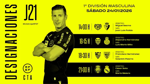 Actualidad Inicio Noticias Todas Categorías Institucional Expand Secondary Navigation Menu Presidencia Juntas directivas Igualdad Responsabilidad Social y Sostenibilidad Integridad Protección de la infancia Área médica Elecciones 2024 Federaciones Territoriales FIFA Patrocinadores rfef.es Museo Labor federativa Expand Secondary Navigation Menu Concursos Circulares Horarios Sanciones Mundial 2030 Competiciones masculinas Expand Secondary Navigation Menu Primera División Segunda División Primera Federación Segunda Federación Tercera Federación Copa del Rey Mapfre Supercopa Copa Federación Playoff de ascenso Competiciones UEFA Competiciones femeninas Expand Secondary Navigation Menu Primera División Femenina Primera Federación Iberdrola Segunda Federación FUTFEM Tercera Federación FUTFEM Copa de la Reina Iberdrola Supercopa Iberdrola Juveniles fútbol 11 Expand Secondary Navigation Menu División de Honor Juvenil Copa de Campeones Copa del Rey juvenil Youth League Selecciones autonómicas Expand Secondary Navigation Menu Copa de las Regiones de UEFA Femenino sub-16 Masculino sub-16 Femenino sub-14 Masculino sub-14 Femenino sub-12 Masculino sub-12 Fútbol sala Expand Secondary Navigation Menu Primera Masculina FS Primera FS Iberdrola Segunda Masculina FS Segunda Femenina FS Segunda B FS División de Honor Juvenil FS Copa de España Supercopa FS Supercopa Femenina FS Copa del Rey FS Copa de la Reina FS Copa de España Juvenil Campeonato de España Juvenil FS Futsal UEFA Champions League Selecciones autonómicas FS Otras competiciones Fútbol playa Expand Secondary Navigation Menu Primera División Playa Masc Segunda División Playa Masc Primera División Playa Fem Segunda División Playa Fem Copa Federación Playa Supercopa Playa Selecciones autonómicas Playa Campeonatos Clubes Base Playa Selecciones Playa adaptado Grassroots Expand Secondary Navigation Menu Playmakers Árbitros Expand Secondary Navigation Menu Designaciones VAR Expand Secondary Navigation Menu Audios VAR Entrenadores Expand Secondary Navigation Menu Premios Técnicos por el mundo Cursos Formación Expand Secondary Navigation Menu Formación online Formación presencial Selección Absoluta Selecciones Masculinas Expand Secondary Navigation Menu Sub-21 Sub-20 Sub-19 Sub-18 Sub-17 Sub-16 Sub-15 Sub-14 Selección Absoluta Femenina Selecciones Femeninas Expand Secondary Navigation Menu Sub-23 Sub-20 Femenina Sub-19 Femenina Sub-17 Femenina Sub-18 Femenina Sub-16 Femenina Sub-15 Femenina Sub-14 Femenina Selección Olímpica Expand Secondary Navigation Menu Selección Olímpica femenina Selección Olímpica masculina Selecciones fútbol sala masculinas Expand Secondary Navigation Menu Selección Absoluta fútbol sala Sub-23 fútbol sala Sub-21 fútbol sala Sub-18 fútbol sala Sub-19 fútbol sala Sub-17 fútbol sala Sub-16 fútbol sala Sub-15 fútbol sala Selecciones fútbol sala femeninas Expand Secondary Navigation Menu Selección Femenina fútbol sala Sub-23 Femenina fútbol sala Sub-21 Femenina fútbol sala Sub-19 Femenina fútbol sala Sub-18 Femenina fútbol sala Sub-17 Femenina fútbol sala Sub-15 Femenina fútbol sala Selecciones de fútbol playa Expand Secondary Navigation Menu Absoluta Masculina Playa Absoluta Femenina Playa Sub-21 Masculina Playa E-Sports Expand Secondary Navigation Menu e-Copa RFEF Leyendas Aplicar 57202 Resultados. Galería de imágenes en el interior Selección Absoluta fútbol sala España brilla en su debut (1-4) España venció en su debut en el Europeo de fútbol sala. Y, además, lo hizo brillando, dejando el partido muy encarrilado en la primera parte y mostrando verticalidad y mucha variedad ofensiva. Un... 23 Enero 2026 Galería de imágenes en el interior Supercopa Iberdrola El Real Madrid "va a por todas" para la final El equipo blanco ultima su preparación para el clásico de la gran final de la Supercopa de España femenina Iberdrola 23 Enero 2026 Video en el interior Galería de imágenes en el interior Supercopa Iberdrola Todo listo en Castellón para coronar a las supercampeonas Las protagonistas de la final han llevado a cabo el tradicional posado con el trofeo en Castalia, el escenario que acogerá este sábado 'el clásico' entre FC Barcelona y Real Madrid CF 23 Enero 2026 Galería de imágenes en el interior Supercopa Iberdrola El FC Barcelona se prepara en Castalia para "una final de mucho nivel" El conjunto azulgrana ya está listo para el clásico de mañana ante el Real Madrid 23 Enero 2026 Galería de imágenes en el interior Selección Absoluta fútbol sala El embajador en Eslovenia visita a la selección antes del debut El embajador de España en Eslovenia, Javier Herrera, visitó a la selección española antes de su debut en el Europeo precisamente frente a la anfitriona. El diplomático deseó mucha suerte a los de... 23 Enero 2026 Video en el interior Galería de imágenes en el interior Responsabilidad Social y Sostenibilidad, Institucional, Supercopa Iberdrola Exitosa Jornada "Supercampeonas" en Castellón La Supercopa de España femenina Iberdrola acerca hasta Castellón mujeres referentes del deporte con grandes historias de superación 23 Enero 2026 Video en el interior Selección Absoluta fútbol sala Jesús Velasco: "El proceso selectivo ha sido muy duro" El seleccionador de fútbol sala, Jesús Velasco, analizó cómo llega a España a este Europeo y cómo ha sido el proceso para acabar eligiendo los 15 jugadores que están concentrados en Liubliana: "Soy... 23 Enero 2026 VAR, Segunda División, Designaciones Designaciones | Estos son los árbitros para los partidos del sábado 24 de enero de la jornada 23 en Segunda División DESIGNACIÓN ARBITRAL COMPLETA DE LOS PARTIDOS DEL SÁBADO 24 DE ENERO EN SEGUNDA DIVISIÓN 23 Enero 2026 Designaciones, Primera División, VAR Designaciones | Estos son los árbitros para los partidos del sábado 24 de enero de la jornada 21 en Primera División DESIGNACIÓN ARBITRAL COMPLETA DE LOS PARTIDOS DEL SÁBADO 24 DE 