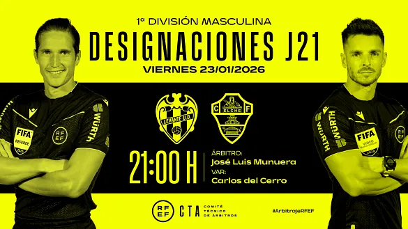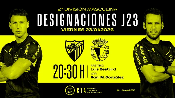 Actualidad Inicio Noticias Todas Categorías Institucional Expand Secondary Navigation Menu Presidencia Juntas directivas Igualdad Responsabilidad Social y Sostenibilidad Integridad Protección de la infancia Área médica Elecciones 2024 Federaciones Territoriales FIFA Patrocinadores rfef.es Museo Labor federativa Expand Secondary Navigation Menu Concursos Circulares Horarios Sanciones Mundial 2030 Competiciones masculinas Expand Secondary Navigation Menu Primera División Segunda División Primera Federación Segunda Federación Tercera Federación Copa del Rey Mapfre Supercopa Copa Federación Playoff de ascenso Competiciones UEFA Competiciones femeninas Expand Secondary Navigation Menu Primera División Femenina Primera Federación Iberdrola Segunda Federación FUTFEM Tercera Federación FUTFEM Copa de la Reina Iberdrola Supercopa Iberdrola Juveniles fútbol 11 Expand Secondary Navigation Menu División de Honor Juvenil Copa de Campeones Copa del Rey juvenil Youth League Selecciones autonómicas Expand Secondary Navigation Menu Copa de las Regiones de UEFA Femenino sub-16 Masculino sub-16 Femenino sub-14 Masculino sub-14 Femenino sub-12 Masculino sub-12 Fútbol sala Expand Secondary Navigation Menu Primera Masculina FS Primera FS Iberdrola Segunda Masculina FS Segunda Femenina FS Segunda B FS División de Honor Juvenil FS Copa de España Supercopa FS Supercopa Femenina FS Copa del Rey FS Copa de la Reina FS Copa de España Juvenil Campeonato de España Juvenil FS Futsal UEFA Champions League Selecciones autonómicas FS Otras competiciones Fútbol playa Expand Secondary Navigation Menu Primera División Playa Masc Segunda División Playa Masc Primera División Playa Fem Segunda División Playa Fem Copa Federación Playa Supercopa Playa Selecciones autonómicas Playa Campeonatos Clubes Base Playa Selecciones Playa adaptado Grassroots Expand Secondary Navigation Menu Playmakers Árbitros Expand Secondary Navigation Menu Designaciones VAR Expand Secondary Navigation Menu Audios VAR Entrenadores Expand Secondary Navigation Menu Premios Técnicos por el mundo Cursos Formación Expand Secondary Navigation Menu Formación online Formación presencial Selección Absoluta Selecciones Masculinas Expand Secondary Navigation Menu Sub-21 Sub-20 Sub-19 Sub-18 Sub-17 Sub-16 Sub-15 Sub-14 Selección Absoluta Femenina Selecciones Femeninas Expand Secondary Navigation Menu Sub-23 Sub-20 Femenina Sub-19 Femenina Sub-17 Femenina Sub-18 Femenina Sub-16 Femenina Sub-15 Femenina Sub-14 Femenina Selección Olímpica Expand Secondary Navigation Menu Selección Olímpica femenina Selección Olímpica masculina Selecciones fútbol sala masculinas Expand Secondary Navigation Menu Selección Absoluta fútbol sala Sub-23 fútbol sala Sub-21 fútbol sala Sub-18 fútbol sala Sub-19 fútbol sala Sub-17 fútbol sala Sub-16 fútbol sala Sub-15 fútbol sala Selecciones fútbol sala femeninas Expand Secondary Navigation Menu Selección Femenina fútbol sala Sub-23 Femenina fútbol sala Sub-21 Femenina fútbol sala Sub-19 Femenina fútbol sala Sub-18 Femenina fútbol sala Sub-17 Femenina fútbol sala Sub-15 Femenina fútbol sala Selecciones de fútbol playa Expand Secondary Navigation Menu Absoluta Masculina Playa Absoluta Femenina Playa Sub-21 Masculina Playa E-Sports Expand Secondary Navigation Menu e-Copa RFEF Leyendas Aplicar 57203 Resultados. Video en el interior Sub-17 La alegría de la primera vez Christian Imga, Jorge Domínguez, Byron Mendoza e Ian Mencía se estrenan como goleadores con España 22 Enero 2026 Responsabilidad Social y Sostenibilidad, Institucional, Supercopa Iberdrola Castellón acoge la Jornada Supercampeonas Se celebrará mañana viernes en el marco de la Supercopa de España Femenina Iberdrola 22 Enero 2026 Selección Absoluta fútbol sala Jesús Velasco: "Para nosotros es el partido más complicado" Jesús Velasco compareció en rueda de prensa en la previa del debut en el Europeo frente a Eslovenia (20:30 horas, La 2). El seleccionador destacó la importancia de este encuentro para comenzar con... 22 Enero 2026 Primera Federación Exigencia máxima El Heliodoro Rodríguez López y el Enrique Roca, escenarios de los dos encuentros más destacados de la jornada. 22 Enero 2026 Video en el interior Galería de imágenes en el interior Sub-17 España hace pleno ante Italia La Selección de Sergio García vuelve a ganar a la Azurra (3-0) con tantos de Mendoza, Mencía e Imga 22 Enero 2026 Video en el interior Árbitros Cuando arbitraje y maternidad van de la mano Yolanda Parga, responsable del arbitraje femenino, Mariona Peralta y Elena Mainer, árbitras asistentes, reflexionan sobre cómo compaginar su actividad personal con la profesional 22 Enero 2026 VAR, Segunda División, Designaciones Designaciones | Estos son los árbitros para el partido del viernes 23 de enero de la jornada 23 en Segunda División Designación arbitral completa del partido del viernes 23 de enero en Segunda División 22 Enero 2026 Designaciones, Primera División, VAR Designaciones | Estos son los árbitros para el partido del viernes 23 de enero de la jornada 21 en Primera División DESIGNACIÓN ARBITRAL COMPLETA DEL PARTIDO DEL VIERNES 23 DE ENERO EN PRIMERA DIVISIÓN 22 Enero 2026 Video en el interior Responsabilidad Social y Sostenibilidad, Institucional La garra Irene Paredes camino a la final La capitana del FC Barcelona anotó el segundo gol de su equipo en la semifinal ante el Athletic Club 22 Enero 2026 Designaciones, Primera División Femenina Designaciones | Estas son las árbitras de la jornada 17 en Primera División femenina DESIGNACIÓN ARBITRAL COMPLETA DE LA JORNADA 17 EN PRIMERA DIVISIÓN FEMENINA 22 Enero 2026 Designaciones, Supercopa Iberdrola Designaciones | Estas son las árbitras de la final de la Supercopa de España femenina DESIGNACIÓN ARBITRAL COMPLETA DE LA FINAL DE LA SUPERCOPA DE ESPAÑA FEMENINA 22 Enero 2026 Ver más Ver más