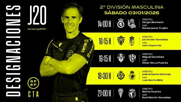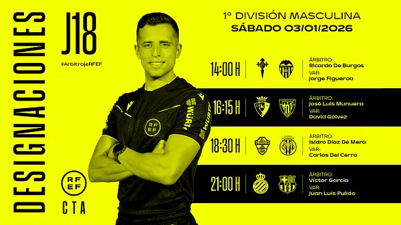 Actualidad Inicio Noticias Todas Categorías Institucional Expand Secondary Navigation Menu Presidencia Juntas directivas Igualdad Responsabilidad Social y Sostenibilidad Integridad Protección de la infancia Área médica Elecciones 2024 Federaciones Territoriales FIFA Patrocinadores rfef.es Museo Labor federativa Expand Secondary Navigation Menu Concursos Circulares Horarios Sanciones Mundial 2030 Competiciones masculinas Expand Secondary Navigation Menu Primera División Segunda División Primera Federación Segunda Federación Tercera Federación Copa del Rey Mapfre Supercopa Copa Federación Playoff de ascenso Competiciones UEFA Competiciones femeninas Expand Secondary Navigation Menu Primera División Femenina Primera Federación Iberdrola Segunda Federación FUTFEM Tercera Federación FUTFEM Copa de la Reina Iberdrola Supercopa Iberdrola Juveniles fútbol 11 Expand Secondary Navigation Menu División de Honor Juvenil Copa de Campeones Copa del Rey juvenil Youth League Selecciones autonómicas Expand Secondary Navigation Menu Copa de las Regiones de UEFA Femenino sub-16 Masculino sub-16 Femenino sub-14 Masculino sub-14 Femenino sub-12 Masculino sub-12 Fútbol sala Expand Secondary Navigation Menu Primera Masculina FS Primera FS Iberdrola Segunda Masculina FS Segunda Femenina FS Segunda B FS División de Honor Juvenil FS Copa de España Supercopa FS Supercopa Femenina FS Copa del Rey FS Copa de la Reina FS Copa de España Juvenil Campeonato de España Juvenil FS Futsal UEFA Champions League Selecciones autonómicas FS Otras competiciones Fútbol playa Expand Secondary Navigation Menu Primera División Playa Masc Segunda División Playa Masc Primera División Playa Fem Segunda División Playa Fem Copa Federación Playa Supercopa Playa Selecciones autonómicas Playa Campeonatos Clubes Base Playa Selecciones Playa adaptado Grassroots Expand Secondary Navigation Menu Playmakers Árbitros Expand Secondary Navigation Menu Designaciones VAR Expand Secondary Navigation Menu Audios VAR Entrenadores Expand Secondary Navigation Menu Premios Técnicos por el mundo Cursos Formación Expand Secondary Navigation Menu Formación online Formación presencial Selección Absoluta Selecciones Masculinas Expand Secondary Navigation Menu Sub-21 Sub-20 Sub-19 Sub-18 Sub-17 Sub-16 Sub-15 Sub-14 Selección Absoluta Femenina Selecciones Femeninas Expand Secondary Navigation Menu Sub-23 Sub-20 Femenina Sub-19 Femenina Sub-17 Femenina Sub-18 Femenina Sub-16 Femenina Sub-15 Femenina Sub-14 Femenina Selección Olímpica Expand Secondary Navigation Menu Selección Olímpica femenina Selección Olímpica masculina Selecciones fútbol sala masculinas Expand Secondary Navigation Menu Selección Absoluta fútbol sala Sub-23 fútbol sala Sub-21 fútbol sala Sub-18 fútbol sala Sub-19 fútbol sala Sub-17 fútbol sala Sub-16 fútbol sala Sub-15 fútbol sala Selecciones fútbol sala femeninas Expand Secondary Navigation Menu Selección Femenina fútbol sala Sub-23 Femenina fútbol sala Sub-21 Femenina fútbol sala Sub-19 Femenina fútbol sala Sub-18 Femenina fútbol sala Sub-17 Femenina fútbol sala Sub-15 Femenina fútbol sala Selecciones de fútbol playa Expand Secondary Navigation Menu Absoluta Masculina Playa Absoluta Femenina Playa Sub-21 Masculina Playa E-Sports Expand Secondary Navigation Menu e-Copa RFEF Leyendas Aplicar 57057 Resultados. Video en el interior Selección Absoluta Femenina INSIDE | Las reinas de la Nations volvieron a brillar Imágenes inéditas del doble duelo ante las alemanas para levantar, por segunda vez, el trofeo de campeonas de la UWNL 02 Enero 2026 Supercopa FS PREVIA | La Supercopa de España estrena el año futsalero Illes Balears Palma Futsal como anfitrión, Servigroup Peñíscola, Jimbee Cartagena Costa Cálida y Movistar Inter pelearán por el primer título del curso 02 Enero 2026 Segunda División, Designaciones, VAR Designaciones | Estos son los árbitros para los partidos del sábado 3 de enero de la jornada 20 en Segunda División DESIGNACIÓN ARBITRAL COMPLETA DE LOS PARTIDOS DEL SÁBADO 3 DE ENERO DE LA JORNADA 20 EN SEGUNDA DIVISIÓN 02 Enero 2026 Primera División, Designaciones, VAR Designaciones | Estos son los árbitros para los partidos del sábado 3 de enero de la jornada 18 en Primera División DESIGNACIÓN ARBITRAL COMPLETA DE LOS PARTIDOS DEL SÁBADO 3 DE ENERO DE LA JORNADA 18 EN PRIMERA DIVISIÓN 02 Enero 2026 Designaciones, Segunda Federación DESIGNACIONES | Definidos los árbitros que dirigirán la decimoséptima jornada de la temporada 2025/26 Los 90 equipos de Segunda Federación jugarán entre el sábado 3 y el domingo 4 de enero 02 Enero 2026 Primera Federación, Designaciones DESIGNACIONES | Definidos los árbitros que dirigirán la decimoctava jornada de la temporada 2025/26 La decimoquinta jornada se disputará entre el sábado 3 y el domingo 4 de enero 02 Enero 2026 Formación Abierto el plazo de preinscripción para el ‘VII CSU de Director Deportivo en Fútbol’ de la RFEF El curso, en colaboración con la Universidad Rey Juan Carlos, se realizará de forma presencial del 2 de febrero al 25 de mayo de 2026 y el periodo de preinscripción está abierto hasta el 23 de enero de 2026 02 Enero 2026 Supercopa FS ¡Aquí tienes el dosier de la Supercopa de España! Un documento donde encontrarás todo lo que necesitas saber sobre la Supercopa de España 2026, que se disputará, los días 3 y 4 de enero, en el Palau Municipal d' Esports Son Moix 02 Enero 2026 Primera Federación PREVIA | Vuelta al ruedo Regresa la Primera Federación Versus e-Learning para arrancar el 2026 con el emociómetro al máximo 02 Enero 2026 Segunda Federación PREVIA | 2026 arranca en el ecuador La Segunda Federación alcanza, en su primera jornada del año, el ecuador de la competición 02 Enero 2026 Primera FS Iberdrola Inicio de año de máxima exigencia en la Primera FS Iberdrola La primera de tres jornadas en ocho días, con duelos clave por el liderato, los playoffs y la perm