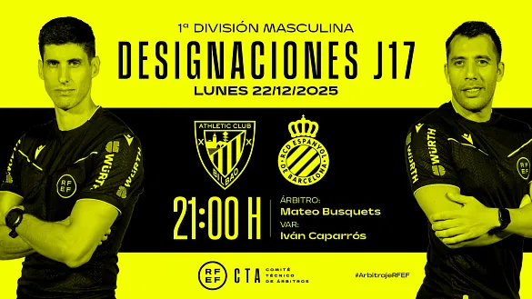 Actualidad Inicio Noticias Todas Categorías Institucional Expand Secondary Navigation Menu Presidencia Juntas directivas Igualdad Responsabilidad Social y Sostenibilidad Integridad Protección de la infancia Área médica Elecciones 2024 Federaciones Territoriales FIFA Patrocinadores rfef.es Museo Labor federativa Expand Secondary Navigation Menu Concursos Circulares Horarios Sanciones Mundial 2030 Competiciones masculinas Expand Secondary Navigation Menu Primera División Segunda División Primera Federación Segunda Federación Tercera Federación Copa del Rey Mapfre Supercopa Copa Federación Playoff de ascenso Competiciones UEFA Competiciones femeninas Expand Secondary Navigation Menu Primera División Femenina Primera Federación Iberdrola Segunda Federación FUTFEM Tercera Federación FUTFEM Copa de la Reina Iberdrola Supercopa Iberdrola Juveniles fútbol 11 Expand Secondary Navigation Menu División de Honor Juvenil Copa de Campeones Copa del Rey juvenil Youth League Selecciones autonómicas Expand Secondary Navigation Menu Copa de las Regiones de UEFA Femenino sub-16 Masculino sub-16 Femenino sub-14 Masculino sub-14 Femenino sub-12 Masculino sub-12 Fútbol sala Expand Secondary Navigation Menu Primera Masculina FS Primera FS Iberdrola Segunda Masculina FS Segunda Femenina FS Segunda B FS División de Honor Juvenil FS Copa de España Supercopa FS Supercopa Femenina FS Copa del Rey FS Copa de la Reina FS Copa de España Juvenil Campeonato de España Juvenil FS Futsal UEFA Champions League Selecciones autonómicas FS Otras competiciones Fútbol playa Expand Secondary Navigation Menu Primera División Playa Masc Segunda División Playa Masc Primera División Playa Fem Segunda División Playa Fem Copa Federación Playa Supercopa Playa Selecciones autonómicas Playa Campeonatos Clubes Base Playa Selecciones Playa adaptado Grassroots Expand Secondary Navigation Menu Playmakers Árbitros Expand Secondary Navigation Menu Designaciones VAR Expand Secondary Navigation Menu Audios VAR Entrenadores Expand Secondary Navigation Menu Premios Técnicos por el mundo Cursos Formación Expand Secondary Navigation Menu Formación online Formación presencial Selección Absoluta Selecciones Masculinas Expand Secondary Navigation Menu Sub-21 Sub-20 Sub-19 Sub-18 Sub-17 Sub-16 Sub-15 Sub-14 Selección Absoluta Femenina Selecciones Femeninas Expand Secondary Navigation Menu Sub-23 Sub-20 Femenina Sub-19 Femenina Sub-17 Femenina Sub-18 Femenina Sub-16 Femenina Sub-15 Femenina Sub-14 Femenina Selección Olímpica Expand Secondary Navigation Menu Selección Olímpica femenina Selección Olímpica masculina Selecciones fútbol sala masculinas Expand Secondary Navigation Menu Selección Absoluta fútbol sala Sub-23 fútbol sala Sub-21 fútbol sala Sub-18 fútbol sala Sub-19 fútbol sala Sub-17 fútbol sala Sub-16 fútbol sala Sub-15 fútbol sala Selecciones fútbol sala femeninas Expand Secondary Navigation Menu Selección Femenina fútbol sala Sub-23 Femenina fútbol sala Sub-21 Femenina fútbol sala Sub-19 Femenina fútbol sala Sub-18 Femenina fútbol sala Sub-17 Femenina fútbol sala Sub-15 Femenina fútbol sala Selecciones de fútbol playa Expand Secondary Navigation Menu Absoluta Masculina Playa Absoluta Femenina Playa Sub-21 Masculina Playa E-Sports Expand Secondary Navigation Menu e-Copa RFEF Leyendas Aplicar 57051 Resultados. Video en el interior Galería de imágenes en el interior Copa de la Reina Iberdrola Barça y Atlético de Madrid se adjudican las últimas plazas Athletic Club, CD Tenerife Femenino, Real Madrid CF, C Levante Las Planas Badalona, Madrid CFF, Real Sociedad, FC Barcelona y Atlético de Madrid seguirán peleando por ser las reinas de la Copa en 2026 21 Diciembre 2025 Segunda Masculina FS Juanma Marrube regresa al Reyco Burela FS El técnico mariñano dirigirá al conjunto de Segunda División 21 Diciembre 2025 Segunda Masculina FS El Heredia 21 Málaga Ciudad Redonda FS cierra el 2025 como líder La victoria del conjunto malagueño (4-3) frente al Leganés FS, en el duelo de este domingo, permite a los andaluces cerrar el año en lo más alto de la tabla clasificacoria. 21 Diciembre 2025 Designaciones, Primera División, VAR Designaciones | Estos son los árbitros para el partido del lunes 22 de diciembre de la jornada 17 en Primera División DESIGNACIÓN ARBITRAL COMPLETA DE LOS PARTIDOS DEL LUNES 22 DE DICIEMBRE DE LA JORNADA 17 EN PRIMERA DIVISIÓN 21 Diciembre 2025 Video en el interior Primera Federación RESÚMENES | Cierre navideño Disfruta de los mejores momentos de la jornada 17 21 Diciembre 2025 Video en el interior Primera FS Iberdrola RESÚMENES | Última cita del año cargada de goles Todos los goles de la 11ª jornada de liga, ¡A golpe de click! 21 Diciembre 2025 Galería de imágenes en el interior Sub-19 España, campeona de la International SBS Cup Empató a cero contra la Selección de Shizuoka y ganó 4-2 en los penaltis 21 Diciembre 2025 Primera FS Iberdrola Cierre redondo al 2025 en la Primera FS Iberdrola Jornada marcada por la igualdad en la que se anotaron un total de 59 goles 21 Diciembre 2025 Video en el interior Audios VAR, Primera División Audios de las revisiones VAR de la 17ª jornada en Primera División de la temporada 2025/26 Estos audios se publicarán durante cada jornada de Primera y Segunda División de la temporada 2025/2026 20 Diciembre 2025 Video en el interior Galería de imágenes en el interior Copa de la Reina Iberdrola La mitad de los billetes a cuartos ya están repartidos Athletic Club, CD Tenerife Femenino, Levante Las Planas Badalona y Real Madrid CF seguirán compitiendo en la Copa de la Reina durante 2026. Quedan cuatro plazas por decidirse 20 Diciembre 2025 Video en el interior Primera FS Iberdrola Jornada de revanchas y despedidas en la Primera FS Iberdrola El Futsi Atlético Navalcarnero se cuela en los puestos de playoffs 20 Diciembre 2025 Ver más Ver más