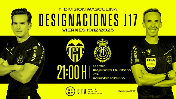 Actualidad Inicio Noticias Todas Categorías Institucional Expand Secondary Navigation Menu Presidencia Juntas directivas Igualdad Responsabilidad Social y Sostenibilidad Integridad Protección de la infancia Área médica Elecciones 2024 Federaciones Territoriales FIFA Patrocinadores rfef.es Museo Labor federativa Expand Secondary Navigation Menu Concursos Circulares Horarios Sanciones Mundial 2030 Competiciones masculinas Expand Secondary Navigation Menu Primera División Segunda División Primera Federación Segunda Federación Tercera Federación Copa del Rey Mapfre Supercopa Copa Federación Playoff de ascenso Competiciones UEFA Competiciones femeninas Expand Secondary Navigation Menu Primera División Femenina Primera Federación Iberdrola Segunda Federación FUTFEM Tercera Federación FUTFEM Copa de la Reina Iberdrola Supercopa Iberdrola Juveniles fútbol 11 Expand Secondary Navigation Menu División de Honor Juvenil Copa de Campeones Copa del Rey juvenil Youth League Selecciones autonómicas Expand Secondary Navigation Menu Copa de las Regiones de UEFA Femenino sub-16 Masculino sub-16 Femenino sub-14 Masculino sub-14 Femenino sub-12 Masculino sub-12 Fútbol sala Expand Secondary Navigation Menu Primera Masculina FS Primera FS Iberdrola Segunda Masculina FS Segunda Femenina FS Segunda B FS División de Honor Juvenil FS Copa de España Supercopa FS Supercopa Femenina FS Copa del Rey FS Copa de la Reina FS Copa de España Juvenil Campeonato de España Juvenil FS Futsal UEFA Champions League Selecciones autonómicas FS Otras competiciones Fútbol playa Expand Secondary Navigation Menu Primera División Playa Masc Segunda División Playa Masc Primera División Playa Fem Segunda División Playa Fem Copa Federación Playa Supercopa Playa Selecciones autonómicas Playa Campeonatos Clubes Base Playa Selecciones Playa adaptado Grassroots Expand Secondary Navigation Menu Playmakers Árbitros Expand Secondary Navigation Menu Designaciones VAR Expand Secondary Navigation Menu Audios VAR Entrenadores Expand Secondary Navigation Menu Premios Técnicos por el mundo Cursos Formación Expand Secondary Navigation Menu Formación online Formación presencial Selección Absoluta Selecciones Masculinas Expand Secondary Navigation Menu Sub-21 Sub-20 Sub-19 Sub-18 Sub-17 Sub-16 Sub-15 Sub-14 Selección Absoluta Femenina Selecciones Femeninas Expand Secondary Navigation Menu Sub-23 Sub-20 Femenina Sub-19 Femenina Sub-17 Femenina Sub-18 Femenina Sub-16 Femenina Sub-15 Femenina Sub-14 Femenina Selección Olímpica Expand Secondary Navigation Menu Selección Olímpica femenina Selección Olímpica masculina Selecciones fútbol sala masculinas Expand Secondary Navigation Menu Selección Absoluta fútbol sala Sub-23 fútbol sala Sub-21 fútbol sala Sub-18 fútbol sala Sub-19 fútbol sala Sub-17 fútbol sala Sub-16 fútbol sala Sub-15 fútbol sala Selecciones fútbol sala femeninas Expand Secondary Navigation Menu Selección Femenina fútbol sala Sub-23 Femenina fútbol sala Sub-21 Femenina fútbol sala Sub-19 Femenina fútbol sala Sub-18 Femenina fútbol sala Sub-17 Femenina fútbol sala Sub-15 Femenina fútbol sala Selecciones de fútbol playa Expand Secondary Navigation Menu Absoluta Masculina Playa Absoluta Femenina Playa Sub-21 Masculina Playa E-Sports Expand Secondary Navigation Menu e-Copa RFEF Leyendas Aplicar 57054 Resultados. Designaciones, Copa de la Reina Iberdrola Designaciones | Estas son las árbitras de los octavos de final de la Copa de la Reina DESIGNACIÓN ARBITRAL COMPLETA DE LOS OCTAVOS DE FINAL DE LA COPA DE LA REINA 18 Diciembre 2025 Designaciones, Segunda División, VAR Designaciones | Estos son los árbitros para el partido del viernes 19 de diciembre de la jornada 19 en Segunda División DESIGNACIÓN ARBITRAL COMPLETA DEL PARTIDO DEL VIERNES 19 DE DICIEMBRE DE LA JORNADA 19 EN SEGUNDA DIVISIÓN 18 Diciembre 2025 Galería de imágenes en el interior Sub-19 Goles y buen fútbol en el debut (3-0) El combinado nacional dominó con claridad a Australia y suma un importante triunfo antes de medirse con Japón en la SBS Cup 18 Diciembre 2025 Designaciones, VAR, Primera División Designaciones | Estos son los árbitros para el partido del viernes 19 de diciembre de la jornada 17 en Primera División DESIGNACIÓN ARBITRAL COMPLETA DEL PARTIDO DEL VIERNES 19 DE DICIEMBRE DE LA JORNADA 17 EN PRIMERA DIVISIÓN 18 Diciembre 2025 Copa de la Reina FS Vuelve a ver todos los encuentros de los octavos de final de la Copa de la Reina de fútbol sala Los ocho equipos clasificados disputarán la fase final del torneo a principios del mes de mayo 18 Diciembre 2025 Selección Absoluta fútbol sala La selección viaja a Serbia con 14 jugadores La selección absoluta de fútbol sala viaja este jueves a Serbia, donde el sábado y el lunes disputará sus dos últimos amistosos del año. Los de Jesús Velasco viajan a Nis, donde se disputará el... 18 Diciembre 2025 Sub-19 El España-Australia de la SBS Cup, en directo La selección de Paco Gallardo disputa este jueves su primer partido en este torneo internacional que se celebra en Japón 18 Diciembre 2025 Video en el interior Copa del Rey Mapfre RESÚMENES | Tres sorpresas en una tarde-noche mágica CyD Leonesa, Real Racing Club, Atlético de Madrid, CA Osasuna, Albacete Balompié, Real Madrid CF y Deportivo Alavés se convierten en equipos de octavos de final 17 Diciembre 2025 Video en el interior Copa de la Reina FS Definidos los últimos cuartofinalistas de la Copa de la Reina Nueces de Ronda Atlético Torcal, Poio Pescamar, CDE Leganés Masdeporte y Melilla CD Torreblanca obtienen el billete para la siguiente eliminatoria del torneo copero 17 Diciembre 2025 Galería de imágenes en el interior Sub-21 fútbol sala Una victoria de autoridad (4-0) La selección sub-21 cerró con una convincente victoria su concentración en Astorga. Los de Albert Canillas se impusieron con autoridad a Marruecos en un partido de alta intensidad en el que... 17 Diciembre 2025 S