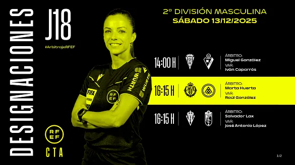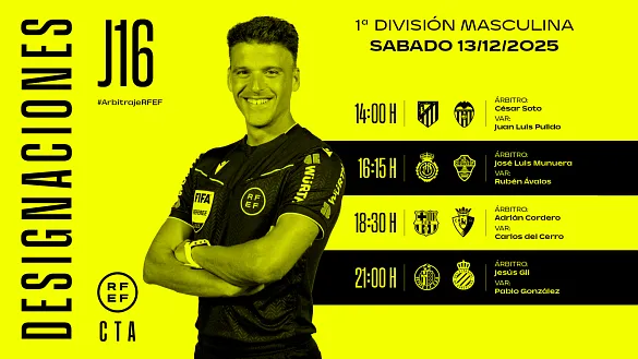 Actualidad Inicio Noticias Todas Categorías Institucional Expand Secondary Navigation Menu Presidencia Juntas directivas Igualdad Responsabilidad Social y Sostenibilidad Integridad Protección de la infancia Área médica Elecciones 2024 Federaciones Territoriales FIFA Patrocinadores rfef.es Museo Labor federativa Expand Secondary Navigation Menu Concursos Circulares Horarios Sanciones Mundial 2030 Competiciones masculinas Expand Secondary Navigation Menu Primera División Segunda División Primera Federación Segunda Federación Tercera Federación Copa del Rey Mapfre Supercopa Copa Federación Playoff de ascenso Competiciones UEFA Competiciones femeninas Expand Secondary Navigation Menu Primera División Femenina Primera Federación Iberdrola Segunda Federación FUTFEM Tercera Federación FUTFEM Copa de la Reina Iberdrola Supercopa Iberdrola Juveniles fútbol 11 Expand Secondary Navigation Menu División de Honor Juvenil Copa de Campeones Copa del Rey juvenil Youth League Selecciones autonómicas Expand Secondary Navigation Menu Copa de las Regiones de UEFA Femenino sub-16 Masculino sub-16 Femenino sub-14 Masculino sub-14 Femenino sub-12 Masculino sub-12 Fútbol sala Expand Secondary Navigation Menu Primera Masculina FS Primera FS Iberdrola Segunda Masculina FS Segunda Femenina FS Segunda B FS División de Honor Juvenil FS Copa de España Supercopa FS Supercopa Femenina FS Copa del Rey FS Copa de la Reina FS Copa de España Juvenil Campeonato de España Juvenil FS Futsal UEFA Champions League Selecciones autonómicas FS Otras competiciones Fútbol playa Expand Secondary Navigation Menu Primera División Playa Masc Segunda División Playa Masc Primera División Playa Fem Segunda División Playa Fem Copa Federación Playa Supercopa Playa Selecciones autonómicas Playa Campeonatos Clubes Base Playa Selecciones Playa adaptado Grassroots Expand Secondary Navigation Menu Playmakers Árbitros Expand Secondary Navigation Menu Designaciones VAR Expand Secondary Navigation Menu Audios VAR Entrenadores Expand Secondary Navigation Menu Premios Técnicos por el mundo Cursos Formación Expand Secondary Navigation Menu Formación online Formación presencial Selección Absoluta Selecciones Masculinas Expand Secondary Navigation Menu Sub-21 Sub-20 Sub-19 Sub-18 Sub-17 Sub-16 Sub-15 Sub-14 Selección Absoluta Femenina Selecciones Femeninas Expand Secondary Navigation Menu Sub-23 Sub-20 Femenina Sub-19 Femenina Sub-17 Femenina Sub-18 Femenina Sub-16 Femenina Sub-15 Femenina Sub-14 Femenina Selección Olímpica Expand Secondary Navigation Menu Selección Olímpica femenina Selección Olímpica masculina Selecciones fútbol sala masculinas Expand Secondary Navigation Menu Selección Absoluta fútbol sala Sub-23 fútbol sala Sub-21 fútbol sala Sub-18 fútbol sala Sub-19 fútbol sala Sub-17 fútbol sala Sub-16 fútbol sala Sub-15 fútbol sala Selecciones fútbol sala femeninas Expand Secondary Navigation Menu Selección Femenina fútbol sala Sub-23 Femenina fútbol sala Sub-21 Femenina fútbol sala Sub-19 Femenina fútbol sala Sub-18 Femenina fútbol sala Sub-17 Femenina fútbol sala Sub-15 Femenina fútbol sala Selecciones de fútbol playa Expand Secondary Navigation Menu Absoluta Masculina Playa Absoluta Femenina Playa Sub-21 Masculina Playa E-Sports Expand Secondary Navigation Menu e-Copa RFEF Leyendas Aplicar 57056 Resultados. Primera Federación Iberdrola PREVIA | Un fin de semana al calor de Primera Federación Iberdrola Continúa la emoción de la segunda máxima categoría del fútbol femenino español 12 Diciembre 2025 Árbitros, FIFA Los árbitros Javier Alberola y Eugenia Gil ascienden a la categoría FIRST de UEFA FIFA ha comunicado oficialmente el ascenso de categoría de dos de los árbitros internacionales del Comité Técnico de Árbitros de la Real Federación Española de Fútbol. De esta manera, Javier Alberola... 12 Diciembre 2025 Institucional, Presidencia Rafael Louzán se reúne en la Ciudad del Fútbol con el presidente de la Federación Navarra, Rafael del Amo El presidente de la RFEF ha mantenido un encuentro con el dirigente de la Federación Navarra en el que ambos han tratado diversas cuestiones de la actualidad común del fútbol español 12 Diciembre 2025 Video en el interior Selecciones autonómicas, Femenino sub-16, Femenino sub-14 Los CESA femeninos, al detalle Todos los partidos de la primera fase de los Campeonatos de España de Selecciones Autonómicas Femeninas sub-16 y sub-14, en directo en rfef.es 12 Diciembre 2025 Video en el interior Selecciones autonómicas, Femenino sub-16 Un repaso al Campeonato de España de Selecciones Autonómicas sub-16 Femeninas 17 combinados han disputado las tres jornadas de la primera fase desde el viernes 12 hasta el domingo 14 de diciembre 12 Diciembre 2025 Galería de imágenes en el interior Selección Femenina fútbol sala Italia y dos clasificados de la Main Round, rivales en la clasificación para la Euro 2027 La seleccIón femenina de fútbol sala ya conoce uno de sus rivales en la fase de clasificación para el Europeo de 2027, que se disputará en la localidad croata de Osijek. Las de Clàudia Pons se... 12 Diciembre 2025 Video en el interior Selecciones autonómicas, Femenino sub-14 El Campeonato de España de Selecciones Autonómicas sub-14 Femeninas, al completo 18 combinados han disputado las tres jornadas de la primera fase desde el viernes 12 hasta el domingo 14 de diciembre 12 Diciembre 2025 Designaciones, VAR, Segunda División Designaciones | Estos son los árbitros para los partidos del sabado 13 de diciembre de la jornada 18 en Segunda División DESIGNACIONES ARBITRALES COMPLETAS DE LOS PARTIDOS DEL SÁBADO 13 DE DICIEMBRE DE LA JORNADA 18 EN SEGUNDA DIVISIÓN 12 Diciembre 2025 Designaciones, VAR, Primera División Designaciones | Estos son los árbitros para los partidos del sábado 13 de diciembre de la jornada 16 en Primera División DESIGNACIÓN ARBITRAL COMPLETA DE LOS PARTIDOS DEL SÁBADO 13 DE DICIEMBRE DE LA