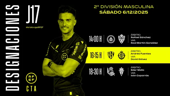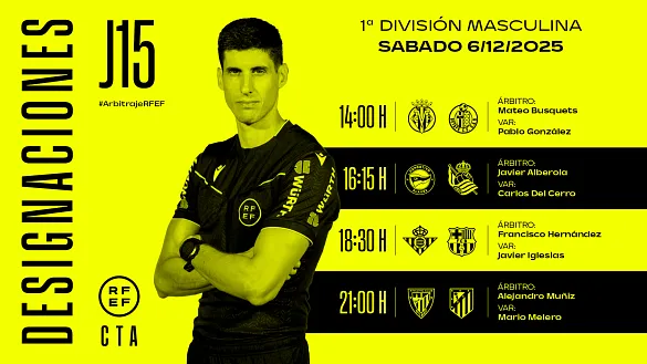 Actualidad Inicio Noticias Todas Categorías Institucional Expand Secondary Navigation Menu Presidencia Juntas directivas Igualdad Responsabilidad Social y Sostenibilidad Integridad Protección de la infancia Área médica Elecciones 2024 Federaciones Territoriales FIFA Patrocinadores rfef.es Museo Labor federativa Expand Secondary Navigation Menu Concursos Circulares Horarios Sanciones Mundial 2030 Competiciones masculinas Expand Secondary Navigation Menu Primera División Segunda División Primera Federación Segunda Federación Tercera Federación Copa del Rey Mapfre Supercopa Copa Federación Playoff de ascenso Competiciones UEFA Competiciones femeninas Expand Secondary Navigation Menu Primera División Femenina Primera Federación Iberdrola Segunda Federación FUTFEM Tercera Federación FUTFEM Copa de la Reina Iberdrola Supercopa Iberdrola Juveniles fútbol 11 Expand Secondary Navigation Menu División de Honor Juvenil Copa de Campeones Copa del Rey juvenil Youth League Selecciones autonómicas Expand Secondary Navigation Menu Copa de las Regiones de UEFA Femenino sub-16 Masculino sub-16 Femenino sub-14 Masculino sub-14 Femenino sub-12 Masculino sub-12 Fútbol sala Expand Secondary Navigation Menu Primera Masculina FS Primera FS Iberdrola Segunda Masculina FS Segunda Femenina FS Segunda B FS División de Honor Juvenil FS Copa de España Supercopa FS Supercopa Femenina FS Copa del Rey FS Copa de la Reina FS Copa de España Juvenil Campeonato de España Juvenil FS Futsal UEFA Champions League Selecciones autonómicas FS Otras competiciones Fútbol playa Expand Secondary Navigation Menu Primera División Playa Masc Segunda División Playa Masc Primera División Playa Fem Segunda División Playa Fem Copa Federación Playa Supercopa Playa Selecciones autonómicas Playa Campeonatos Clubes Base Playa Selecciones Playa adaptado Grassroots Expand Secondary Navigation Menu Playmakers Árbitros Expand Secondary Navigation Menu Designaciones VAR Expand Secondary Navigation Menu Audios VAR Entrenadores Expand Secondary Navigation Menu Premios Técnicos por el mundo Cursos Formación Expand Secondary Navigation Menu Formación online Formación presencial Selección Absoluta Selecciones Masculinas Expand Secondary Navigation Menu Sub-21 Sub-20 Sub-19 Sub-18 Sub-17 Sub-16 Sub-15 Sub-14 Selección Absoluta Femenina Selecciones Femeninas Expand Secondary Navigation Menu Sub-23 Sub-20 Femenina Sub-19 Femenina Sub-17 Femenina Sub-18 Femenina Sub-16 Femenina Sub-15 Femenina Sub-14 Femenina Selección Olímpica Expand Secondary Navigation Menu Selección Olímpica femenina Selección Olímpica masculina Selecciones fútbol sala masculinas Expand Secondary Navigation Menu Selección Absoluta fútbol sala Sub-23 fútbol sala Sub-21 fútbol sala Sub-18 fútbol sala Sub-19 fútbol sala Sub-17 fútbol sala Sub-16 fútbol sala Sub-15 fútbol sala Selecciones fútbol sala femeninas Expand Secondary Navigation Menu Selección Femenina fútbol sala Sub-23 Femenina fútbol sala Sub-21 Femenina fútbol sala Sub-19 Femenina fútbol sala Sub-18 Femenina fútbol sala Sub-17 Femenina fútbol sala Sub-15 Femenina fútbol sala Selecciones de fútbol playa Expand Secondary Navigation Menu Absoluta Masculina Playa Absoluta Femenina Playa Sub-21 Masculina Playa E-Sports Expand Secondary Navigation Menu e-Copa RFEF Leyendas Aplicar 57050 Resultados. Designaciones, VAR, Segunda División Designaciones | Estos son los árbitros para los partidos del sábado 6 de diciembre de la jornada 17 en Segunda División DESIGNACIÓN ARBITRAL COMPLETA DE LOS PARTIDOS DEL SÁBADO 6 DE DICIEMBRE EN SEGUNDA DIVISIÓN 05 Diciembre 2025 Designaciones, VAR, Primera División Designaciones | Estos son los árbitros para los partidos del sábado 6 de diciembre de la jornada 15 en Primera División DESIGNACIÓN ARBITRAL COMPLETA DE LOS PARTIDOS DEL SÁBADO 6 DE DICIEMBRE EN PRIMERA DIVISIÓN 05 Diciembre 2025 Segunda Federación PREVIA | Un puente muy futbolero El puente de la Constitución llega al calendario con una Segunda Federación que vive una emoción constante. 05 Diciembre 2025 Video en el interior Primera Federación RESÚMENES | Suma y sigue Disfruta de los mejores momentos de la jornada 15 05 Diciembre 2025 Selección Femenina fútbol sala Brasil, el gran reto para estar en la final La selección femenina de fútbol sala afronta este viernes (13:30 horas, Teledeporte) uno de los grandes retos en sus 30 años y 200 partidos de historia. El 201 será contra Brasil y nada menos que con... 05 Diciembre 2025 Futsal UEFA Champions League Fe y oficio para los españoles en la Champions League Jimbee Cartagena Costa Cálida e Illes Balears Palma Futsal se plantean encuentros muy distintos para conseguir el mismo objetivo: estar en los cuartos de final de la UEFA Futsal Champions League 05 Diciembre 2025 Primera Federación PREVIA | Pleno al quince La jornada 15 de Primera Federación Versus e-Learning llega sus hogares para estrenar el mes de diciembre. 05 Diciembre 2025 Primera Masculina FS PREVIA | Entre el cielo y el infierno en Primera División El Movistar Inter - Viña Albali Valdepeñas podrá seguirse, en directo, a través de Teledeporte (sábado 6 de diciembre, 13:00 horas) 05 Diciembre 2025 Segunda Masculina FS PREVIA | Jornada trampa en Segunda División El encuentro entre el Gasifred Atlético Ibiza y el Vulcanizados Ruiz Tafa será retransmitido a través de rfef.es el próximo sábado, en directo, a las 17:15 horas 05 Diciembre 2025 Segunda Femenina FS PREVIA | Pulsos por la gloria y la supervivencia Desde el liderato hasta el descenso, cada punto se vuelve oro en una jornada importantísima 05 Diciembre 2025 Video en el interior Copa del Rey Mapfre RESÚMENES | Últimos billetes a los dieciseisavos El martes 9 de diciembre se llevará a cabo el sorteo en la Ciudad del Fútbol de Las Rozas 05 Diciembre 2025 Ver más Ver más