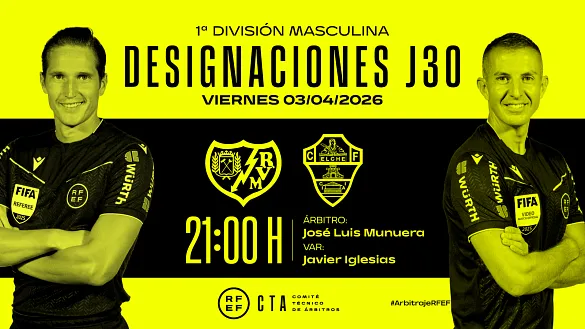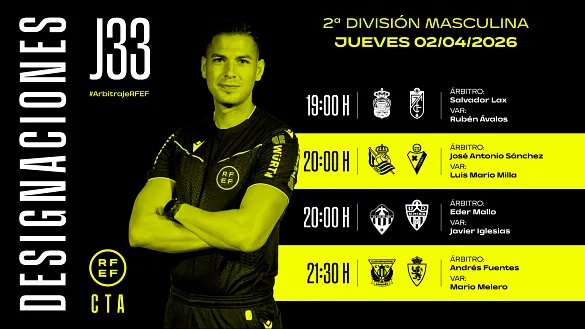Actualidad Inicio Noticias Todas Categorías Institucional Expand Secondary Navigation Menu Presidencia Juntas directivas Igualdad Responsabilidad Social y Sostenibilidad Integridad Protección de la infancia Área médica Elecciones 2024 Federaciones Territoriales FIFA Patrocinadores rfef.es Museo Labor federativa Expand Secondary Navigation Menu Concursos Circulares Horarios Sanciones Mundial 2030 Competiciones masculinas Expand Secondary Navigation Menu Primera División Segunda División Primera Federación Segunda Federación Tercera Federación Copa del Rey Mapfre Supercopa Copa Federación Playoff de ascenso Competiciones UEFA Competiciones femeninas Expand Secondary Navigation Menu Primera División Femenina Primera Federación Iberdrola Segunda Federación FUTFEM Tercera Federación FUTFEM Copa de la Reina Iberdrola Supercopa Iberdrola Juveniles fútbol 11 Expand Secondary Navigation Menu División de Honor Juvenil Copa de Campeones Copa del Rey juvenil Youth League Selecciones autonómicas Expand Secondary Navigation Menu Copa de las Regiones de UEFA Femenino sub-16 Masculino sub-16 Femenino sub-14 Masculino sub-14 Femenino sub-12 Masculino sub-12 Fútbol sala Expand Secondary Navigation Menu Primera Masculina FS Primera FS Iberdrola Segunda Masculina FS Segunda Femenina FS Segunda B FS División de Honor Juvenil FS Copa de España Supercopa FS Supercopa Femenina FS Copa del Rey FS Copa de la Reina FS Copa de España Juvenil Campeonato de España Juvenil FS Futsal UEFA Champions League Selecciones autonómicas FS Otras competiciones Fútbol playa Expand Secondary Navigation Menu Primera División Playa Masc Segunda División Playa Masc Primera División Playa Fem Segunda División Playa Fem Copa Federación Playa Supercopa Playa Selecciones autonómicas Playa Campeonatos Clubes Base Playa Selecciones Playa adaptado Grassroots Expand Secondary Navigation Menu Playmakers Árbitros Expand Secondary Navigation Menu Designaciones VAR Expand Secondary Navigation Menu Audios VAR Entrenadores Expand Secondary Navigation Menu Premios Técnicos por el mundo Cursos Formación Expand Secondary Navigation Menu Formación online Formación presencial Selección Absoluta Selecciones Masculinas Expand Secondary Navigation Menu Sub-21 Sub-20 Sub-19 Sub-18 Sub-17 Sub-16 Sub-15 Sub-14 Selección Absoluta Femenina Selecciones Femeninas Expand Secondary Navigation Menu Sub-23 Sub-20 Femenina Sub-19 Femenina Sub-17 Femenina Sub-18 Femenina Sub-16 Femenina Sub-15 Femenina Sub-14 Femenina Selección Olímpica Expand Secondary Navigation Menu Selección Olímpica femenina Selección Olímpica masculina Selecciones fútbol sala masculinas Expand Secondary Navigation Menu Selección Absoluta fútbol sala Sub-23 fútbol sala Sub-21 fútbol sala Sub-18 fútbol sala Sub-19 fútbol sala Sub-17 fútbol sala Sub-16 fútbol sala Sub-15 fútbol sala Selecciones fútbol sala femeninas Expand Secondary Navigation Menu Selección Femenina fútbol sala Sub-23 Femenina fútbol sala Sub-21 Femenina fútbol sala Sub-19 Femenina fútbol sala Sub-18 Femenina fútbol sala Sub-17 Femenina fútbol sala Sub-15 Femenina fútbol sala Selecciones de fútbol playa Expand Secondary Navigation Menu Absoluta Masculina Playa Absoluta Femenina Playa Sub-21 Masculina Playa E-Sports Expand Secondary Navigation Menu e-Copa RFEF Leyendas Aplicar 57050 Resultados. Designaciones, Primera División Femenina Designaciones | Estas son las árbitras de la jornada 25 en Primera División femenina DESIGNACIÓN ARBITRAL COMPLETA DE LA JORNADA 25 EN PRIMERA DIVISIÓN FEMENINA 02 Abril 2026 Designaciones, Primera División, VAR Designaciones | Estos son los árbitros designados para el partido del viernes 3 de abril en Primera División DESIGNACIÓN ARBITRAL COMPLETA DEL PARTIDO DEL VIERNES 2 DE ABRIL EN PRIMERA DIVISIÓN 02 Abril 2026 Sub-21, Sub-19, Sub-18, Sub-17 Marzo de esplendor para nuestras inferiores La sub-17 y la sub-19 estarán en el Europeo, la sub-21 sigue invicta y tiene muy cerca la clasificación y la sub-18 avanza a la Ronda 2 con paso firme 02 Abril 2026 Primera Masculina FS PREVIA | Un derbi para dominar la Región El encuentro de rivalidad autonómica entre ElPozo Murcia Costa Cálida y Jimbee Cartagena Costa Cálida será retransmitido en directo a través de Teledeporte (sábado, 13:00 horas) 02 Abril 2026 Video en el interior Galería de imágenes en el interior Institucional, Labor federativa Una sonrisa hacia el infinito La RFEF trabaja por la visibilidad e inserción laboral de las personas con trastorno del espectro autista, que esta semana celebran su día mundial bajo el lema: "Menos juicios, más apoyos" 02 Abril 2026 Primera Masculina FS, Designaciones Designaciones | Estos son los árbitros de la Jornada 24 en Primera División de fútbol sala Los encuentros de la 24ª fecha se disputarán los días 3, 4 y 5 de abril de 2026 02 Abril 2026 Primera FS Iberdrola El Atlético Navalcarnero le arrebata la tercera plaza al STV Roldán (3-6) La escuadra rojiblanca vence al equipo murciano con cuatro goles de Irene Córdoba 01 Abril 2026 Video en el interior Sub-19 La fiesta de la sub-19, desde dentro Disfruta de los detalles que no viste del día en el que la Selección logró su pase al Europeo de Gales 01 Abril 2026 Video en el interior Sub-21 Pablo García, un torbellino que enorgullece a su padre El atacante brilló en Alcalá con una asistencia y un golazo ante las lágrimas de emoción de su progenitor 01 Abril 2026 Video en el interior Sub-21 David Gordo, una tarde para siempre El seleccionador sub-21, nacido en Alcalá de Henares, sintió emociones muy especiales con sus amigos y su familia en la grada 01 Abril 2026 Designaciones, Segunda División, VAR Designaciones | Estos son los árbitros para los partidos del jueves 2 de abril en Segunda División DESIGNACIÓN ARBITRAL COMPLETA | SEGUNDA DIVISIÓN | TEMPORADA 2025-2026 | JORNADA 33 | JUEVES 2 DE ABRIL 01 Abril 2026 Ver más Ver más