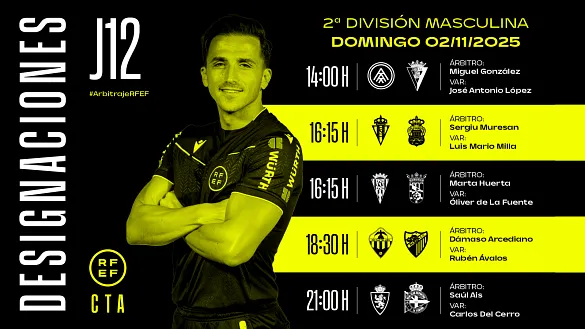 Actualidad Inicio Noticias Todas Categorías Institucional Expand Secondary Navigation Menu Presidencia Juntas directivas Igualdad Responsabilidad Social y Sostenibilidad Integridad Protección de la infancia Área médica Elecciones 2024 Federaciones Territoriales FIFA Patrocinadores rfef.es Museo Labor federativa Expand Secondary Navigation Menu Concursos Circulares Horarios Sanciones Mundial 2030 Competiciones masculinas Expand Secondary Navigation Menu Primera División Segunda División Primera Federación Segunda Federación Tercera Federación Copa del Rey Mapfre Supercopa Copa Federación Playoff de ascenso Competiciones UEFA Competiciones femeninas Expand Secondary Navigation Menu Primera División Femenina Primera Federación Iberdrola Segunda Federación FUTFEM Tercera Federación FUTFEM Copa de la Reina Iberdrola Supercopa Iberdrola Juveniles fútbol 11 Expand Secondary Navigation Menu División de Honor Juvenil Copa de Campeones Copa del Rey juvenil Youth League Selecciones autonómicas Expand Secondary Navigation Menu Copa de las Regiones de UEFA Femenino sub-16 Masculino sub-16 Femenino sub-14 Masculino sub-14 Femenino sub-12 Masculino sub-12 Fútbol sala Expand Secondary Navigation Menu Primera Masculina FS Primera FS Iberdrola Segunda Masculina FS Segunda Femenina FS Segunda B FS División de Honor Juvenil FS Copa de España Supercopa FS Supercopa Femenina FS Copa del Rey FS Copa de la Reina FS Copa de España Juvenil Campeonato de España Juvenil FS Futsal UEFA Champions League Selecciones autonómicas FS Otras competiciones Fútbol playa Expand Secondary Navigation Menu Primera División Playa Masc Segunda División Playa Masc Primera División Playa Fem Segunda División Playa Fem Copa Federación Playa Supercopa Playa Selecciones autonómicas Playa Campeonatos Clubes Base Playa Selecciones Playa adaptado Grassroots Expand Secondary Navigation Menu Playmakers Árbitros Expand Secondary Navigation Menu Designaciones VAR Expand Secondary Navigation Menu Audios VAR Entrenadores Expand Secondary Navigation Menu Premios Técnicos por el mundo Cursos Formación Expand Secondary Navigation Menu Formación online Formación presencial Selección Absoluta Selecciones Masculinas Expand Secondary Navigation Menu Sub-21 Sub-20 Sub-19 Sub-18 Sub-17 Sub-16 Sub-15 Sub-14 Selección Absoluta Femenina Selecciones Femeninas Expand Secondary Navigation Menu Sub-23 Sub-20 Femenina Sub-19 Femenina Sub-17 Femenina Sub-18 Femenina Sub-16 Femenina Sub-15 Femenina Sub-14 Femenina Selección Olímpica Expand Secondary Navigation Menu Selección Olímpica femenina Selección Olímpica masculina Selecciones fútbol sala masculinas Expand Secondary Navigation Menu Selección Absoluta fútbol sala Sub-23 fútbol sala Sub-21 fútbol sala Sub-18 fútbol sala Sub-19 fútbol sala Sub-17 fútbol sala Sub-16 fútbol sala Sub-15 fútbol sala Selecciones fútbol sala femeninas Expand Secondary Navigation Menu Selección Femenina fútbol sala Sub-23 Femenina fútbol sala Sub-21 Femenina fútbol sala Sub-19 Femenina fútbol sala Sub-18 Femenina fútbol sala Sub-17 Femenina fútbol sala Sub-15 Femenina fútbol sala Selecciones de fútbol playa Expand Secondary Navigation Menu Absoluta Masculina Playa Absoluta Femenina Playa Sub-21 Masculina Playa E-Sports Expand Secondary Navigation Menu e-Copa RFEF Leyendas Aplicar 57093 Resultados. Designaciones, VAR, Primera División Designaciones | Estos son los árbitros para el partido del lunes 3 de noviembre de la jornada 11 en Primera División DESIGNACIÓN ARBITRAL COMPLETA DEL PARTIDO DEL LUNES 3 DE NOVIEMBRE EN PRIMERA DIVISIÓN 02 Noviembre 2025 Designaciones, VAR, Segunda División Designaciones | Estos son los árbitros para el partido del lunes 3 de noviembre de la jornada 12 en Segunda División DESIGNACIÓN ARBITRAL COMPLETA DEL PARTIDO DEL LUNES 3 DE NOVIEMBRE EN SEGUNDA DIVISIÓN 02 Noviembre 2025 Fútbol playa España consolida su liderazgo internacional en el fútbol playa de clubes El año 2025 confirma a España como una de las grandes potencias del fútbol playa mundial 02 Noviembre 2025 Primera Federación, Horarios Horarios y televisiones de la jornada 13 de Primera Federación Versus e-Learning Consulta los horarios y televisiones de la decimotercera jornada que se disputará entre el viernes 21, el sábado 22 y el domingo 23 de noviembre 02 Noviembre 2025 Primera Masculina FS RESÚMENES | ElPozo Murcia Costa Cálida se reafirma en el liderato Todos los goles y las mejores imágenes, ¡A golpe de click! 02 Noviembre 2025 Segunda Masculina FS El MRB Móstoles no espera a nadie Los madrileños, recién ascendidos, se alzan por primera vez con el liderato en solitario de la categoría de plata tras su triunfo en Tafalla ante otro debutante como el Vulcanizados Ruiz 02 Noviembre 2025 Futsal UEFA Champions League Vadillo: "Los jugadores han hecho un auténtico partidazo" El equipo balear consigue la clasificación para octavos de final como líder de grupo 01 Noviembre 2025 Futsal UEFA Champions League El Illes Balears Palma Futsal no da opción a la duda El conjunto español cierra su participación con pleno de victorias en la Ronda Principal y encara los octavos de final como primero de grupo y cabeza de serie 01 Noviembre 2025 Primera Masculina FS El Córdoba Patrimonio de la Humanidad rebaja la euforia del Quesos El Hidalgo Manzanares Los andaluces se sitúan a un solo punto de los manchegos, con ambos dentro de las posiciones que dan derecho a la disputa de la Copa de España como principal motivación 01 Noviembre 2025 Video en el interior Primera FS Iberdrola El Castro Bloques Cando pone fin al camino victorioso del líder La victoria del CD Burela ante Penya Esplugues comprime la permanencia 01 Noviembre 2025 Designaciones, VAR, Segunda División Designaciones | Estos son los árbitros para los partidos del domingo 2 de noviembre de la jornada 12 en Segunda División DESIGNACIÓN ARBITRAL COMPLETA DE LOS PARTIDOS DEL DOMINGO 2 DE NOVIEMBRE EN