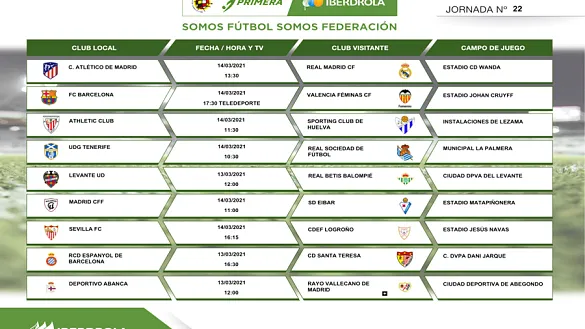 Actualidad Inicio Noticias Todas Categorías Institucional Expand Secondary Navigation Menu Presidencia Juntas directivas Igualdad Responsabilidad Social y Sostenibilidad Integridad Protección de la infancia Área médica Elecciones 2024 Federaciones Territoriales FIFA Patrocinadores rfef.es Museo Labor federativa Expand Secondary Navigation Menu Concursos Circulares Horarios Sanciones Mundial 2030 Competiciones masculinas Expand Secondary Navigation Menu Primera División Segunda División Primera Federación Segunda Federación Tercera Federación Copa del Rey Mapfre Supercopa Copa Federación Playoff de ascenso Competiciones UEFA Competiciones femeninas Expand Secondary Navigation Menu Primera División Femenina Primera Federación Iberdrola Segunda Federación FUTFEM Tercera Federación FUTFEM Copa de la Reina Iberdrola Supercopa Iberdrola Juveniles fútbol 11 Expand Secondary Navigation Menu División de Honor Juvenil Copa de Campeones Copa del Rey juvenil Youth League Selecciones autonómicas Expand Secondary Navigation Menu Copa de las Regiones de UEFA Femenino sub-16 Masculino sub-16 Femenino sub-14 Masculino sub-14 Femenino sub-12 Masculino sub-12 Fútbol sala Expand Secondary Navigation Menu Primera Masculina FS Primera FS Iberdrola Segunda Masculina FS Segunda Femenina FS Segunda B FS División de Honor Juvenil FS Copa de España Supercopa FS Supercopa Femenina FS Copa del Rey FS Copa de la Reina FS Copa de España Juvenil Campeonato de España Juvenil FS Futsal UEFA Champions League Selecciones autonómicas FS Otras competiciones Fútbol playa Expand Secondary Navigation Menu Primera División Playa Masc Segunda División Playa Masc Primera División Playa Fem Segunda División Playa Fem Copa Federación Playa Supercopa Playa Selecciones autonómicas Playa Campeonatos Clubes Base Playa Selecciones Playa adaptado Grassroots Expand Secondary Navigation Menu Playmakers Árbitros Expand Secondary Navigation Menu Designaciones VAR Expand Secondary Navigation Menu Audios VAR Entrenadores Expand Secondary Navigation Menu Premios Técnicos por el mundo Cursos Formación Expand Secondary Navigation Menu Formación online Formación presencial Selección Absoluta Selecciones Masculinas Expand Secondary Navigation Menu Sub-21 Sub-20 Sub-19 Sub-18 Sub-17 Sub-16 Sub-15 Sub-14 Selección Absoluta Femenina Selecciones Femeninas Expand Secondary Navigation Menu Sub-23 Sub-20 Femenina Sub-19 Femenina Sub-17 Femenina Sub-18 Femenina Sub-16 Femenina Sub-15 Femenina Sub-14 Femenina Selección Olímpica Expand Secondary Navigation Menu Selección Olímpica femenina Selección Olímpica masculina Selecciones fútbol sala masculinas Expand Secondary Navigation Menu Selección Absoluta fútbol sala Sub-23 fútbol sala Sub-21 fútbol sala Sub-18 fútbol sala Sub-19 fútbol sala Sub-17 fútbol sala Sub-16 fútbol sala Sub-15 fútbol sala Selecciones fútbol sala femeninas Expand Secondary Navigation Menu Selección Femenina fútbol sala Sub-23 Femenina fútbol sala Sub-21 Femenina fútbol sala Sub-19 Femenina fútbol sala Sub-18 Femenina fútbol sala Sub-17 Femenina fútbol sala Sub-15 Femenina fútbol sala Selecciones de fútbol playa Expand Secondary Navigation Menu Absoluta Masculina Playa Absoluta Femenina Playa Sub-21 Masculina Playa E-Sports Expand Secondary Navigation Menu e-Copa RFEF Leyendas Aplicar 57107 Resultados. Institucional El WiZink Center albergará este 9 de marzo la presentación de la XXXII Copa de España de Fútbol Sala El sorteo, que será emitido en directo, contará con la presencia de Luis Rubiales, presidente de la RFEF 08 Marzo 2021 Galería de imágenes en el interior Selección Absoluta Femenina Jennifer Hermoso, premiada por la Comunidad de Madrid en el Día Internacional de la Mujer La capitana de la Selección Española de Fútbol ha sido reconocida en el ámbito deportivo por su trayectoria personal y profesional 08 Marzo 2021 Competiciones masculinas, Competiciones femeninas, Primera División Femenina HORARIOS | La 22ª jornada en Primera Iberdrola llega con el derbi madrileño como aliciente La jornada se disputará entre el sábado 13 y el domingo 14 de marzo de 2021 08 Marzo 2021 Primera FS Iberdrola ¡La jornada 17 iguala al máximo la Primera RFEF Futsal Femenina! La Primera Fase del campeonato se cerrará el próximo fin de semana 08 Marzo 2021 Árbitros, Designaciones, VAR DESIGNACIONES | Estos son los árbitros del partido aplazado de Primera División Club Atlético de Madrid - Athletic Club DESIGNACIONES ARBITRALES COMPLETAS DEL PARTIDO APLAZADO DE PRIMERA DIVISIÓN CLUB ATLÉTICO DE MADRID - ATHLETIC CLUB 08 Marzo 2021 Sub-19 fútbol sala La Selección Española de Fútbol Sala busca en Jelgava sellar su clasificación para la UEFA Futsal EURO 2022 La Absoluta, con 9 puntos en su casillero, lidera el Grupo 6. Si España vence al combinado letón y Suiza no consigue la victoria ante Eslovenia, la Selección española lograría matemáticamente el billete para el Europeo de Países Bajos 2022 08 Marzo 2021 Selección Absoluta Femenina La Selección Absoluta Femenina alza su voz en el Día Internacional de la Mujer Las internacionales del combinado nacional han querido unirse a esta jornada del 8 de marzo en defensa y reivindicación de los derechos de la mujer 08 Marzo 2021 Competiciones masculinas, Competiciones femeninas, Primera División Femenina, rfef.es Esta es la lista de máximas GOLEADORAS de la Primera Iberdrola Continúa el mano a mano entre las mejores goleadoras de la Primera Iberdrola 07 Marzo 2021 Selección Absoluta fútbol sala Chino: "El trabajo tiene su recompensa y estoy feliz de aportar el mío a la Selección" Javier García Moreno, Chino, nos habla del secreto de la Absoluta. "Esto es una piña. Todos nos llevamos muy bien. Y eso se traslada y se ve en la pista. Es una de las claves de este grupo". El albaceteño agradece la confianza que ha depositado Fede en él 07 Marzo 2021 Competiciones femeninas, Institucional Tres mujeres ref