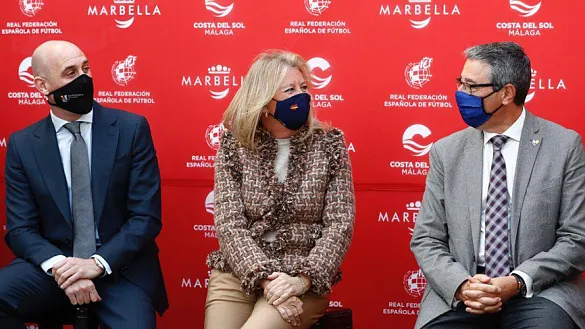El presidente de la RFEF, Luis Rubiales; la alcaldesa de Marbella, Ángeles Muñoz, y el presidente de la Diputación y Turismo Costa del Sol, Francisco Salado, ratificaron hoy este acuerdo en Marbella