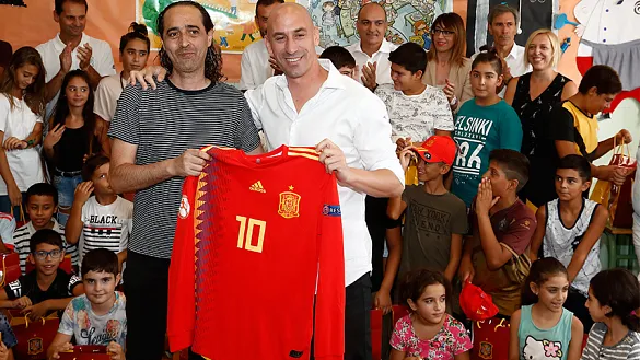 El presidente de la Real Federación Española de Fútbol, Luis Rubiales, acudió hoy al colegio Mediterrani, de Elche, para conocer el programa Edukaló, de mediación y tutorización del alumnado gitano