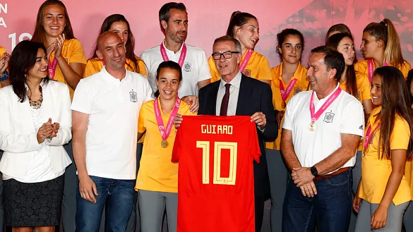 El presidente de la RFEF, Luis Rubiales, junto al ministro de Cultura y Deporte, José Guirao y la secretaria de Estado para el Deporte, María José Rienda, recibió hoy a las jugadoras de...