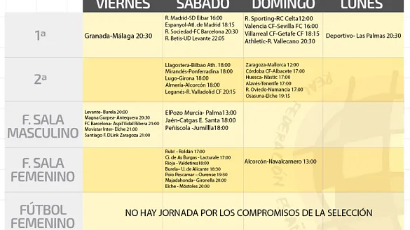 Te ofrecemos aquí los horarios de todos los partidos de fútbol, fútbol sala masculino y femenino que se juegan en España este fin de semana en Primera, Segunda y Segunda B así como en las ligas de fútbol sala