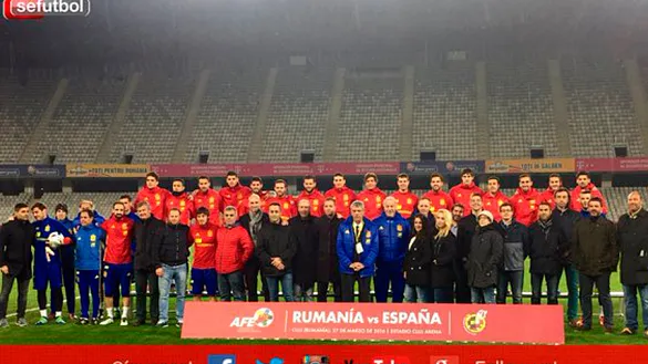 El Presidente de la Real Federación Española de Fútbol compartió foto de familia con miembros de la Asociación de Futbolistas Españoles, desplazados a Rumanía dado que el amistoso de España es a beneficio de AFE