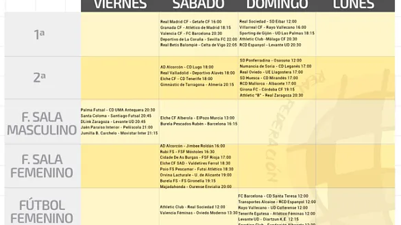 El Campeonato Nacional de Liga de Primera División, Segunda, los 4 grupos de Segunda B, el fútbol sala y el fútbol femenino. Te ofrecemos los horarios de la jornada de tu equipo, y los de sus rivales, de un único vistazo. ¡No te pierdas nada!
