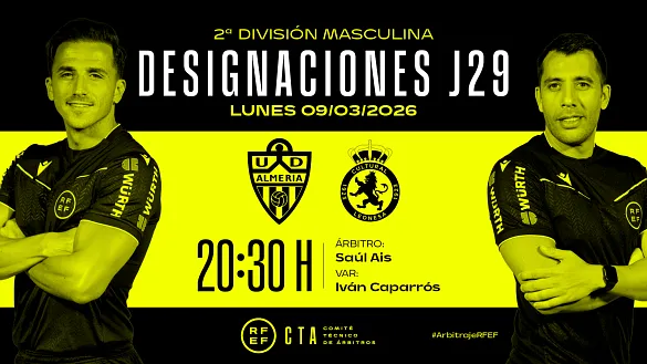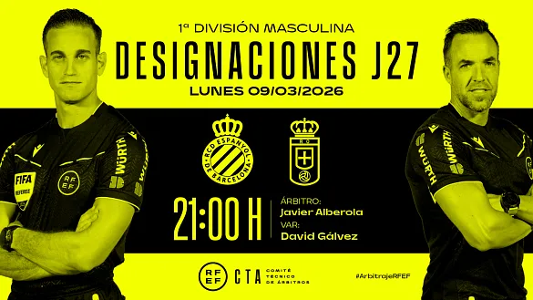 Actualidad Inicio Noticias Todas Categorías Institucional Expand Secondary Navigation Menu Presidencia Juntas directivas Igualdad Responsabilidad Social y Sostenibilidad Integridad Protección de la infancia Área médica Elecciones 2024 Federaciones Territoriales FIFA Patrocinadores rfef.es Museo Labor federativa Expand Secondary Navigation Menu Concursos Circulares Horarios Sanciones Mundial 2030 Competiciones masculinas Expand Secondary Navigation Menu Primera División Segunda División Primera Federación Segunda Federación Tercera Federación Copa del Rey Mapfre Supercopa Copa Federación Playoff de ascenso Competiciones UEFA Competiciones femeninas Expand Secondary Navigation Menu Primera División Femenina Primera Federación Iberdrola Segunda Federación FUTFEM Tercera Federación FUTFEM Copa de la Reina Iberdrola Supercopa Iberdrola Juveniles fútbol 11 Expand Secondary Navigation Menu División de Honor Juvenil Copa de Campeones Copa del Rey juvenil Youth League Selecciones autonómicas Expand Secondary Navigation Menu Copa de las Regiones de UEFA Femenino sub-16 Masculino sub-16 Femenino sub-14 Masculino sub-14 Femenino sub-12 Masculino sub-12 Fútbol sala Expand Secondary Navigation Menu Primera Masculina FS Primera FS Iberdrola Segunda Masculina FS Segunda Femenina FS Segunda B FS División de Honor Juvenil FS Copa de España Supercopa FS Supercopa Femenina FS Copa del Rey FS Copa de la Reina FS Copa de España Juvenil Campeonato de España Juvenil FS Futsal UEFA Champions League Selecciones autonómicas FS Otras competiciones Fútbol playa Expand Secondary Navigation Menu Primera División Playa Masc Segunda División Playa Masc Primera División Playa Fem Segunda División Playa Fem Copa Federación Playa Supercopa Playa Selecciones autonómicas Playa Campeonatos Clubes Base Playa Selecciones Playa adaptado Grassroots Expand Secondary Navigation Menu Playmakers Árbitros Expand Secondary Navigation Menu Designaciones VAR Expand Secondary Navigation Menu Audios VAR Entrenadores Expand Secondary Navigation Menu Premios Técnicos por el mundo Cursos Formación Expand Secondary Navigation Menu Formación online Formación presencial Selección Absoluta Selecciones Masculinas Expand Secondary Navigation Menu Sub-21 Sub-20 Sub-19 Sub-18 Sub-17 Sub-16 Sub-15 Sub-14 Selección Absoluta Femenina Selecciones Femeninas Expand Secondary Navigation Menu Sub-23 Sub-20 Femenina Sub-19 Femenina Sub-17 Femenina Sub-18 Femenina Sub-16 Femenina Sub-15 Femenina Sub-14 Femenina Selección Olímpica Expand Secondary Navigation Menu Selección Olímpica femenina Selección Olímpica masculina Selecciones fútbol sala masculinas Expand Secondary Navigation Menu Selección Absoluta fútbol sala Sub-23 fútbol sala Sub-21 fútbol sala Sub-18 fútbol sala Sub-19 fútbol sala Sub-17 fútbol sala Sub-16 fútbol sala Sub-15 fútbol sala Selecciones fútbol sala femeninas Expand Secondary Navigation Menu Selección Femenina fútbol sala Sub-23 Femenina fútbol sala Sub-21 Femenina fútbol sala Sub-19 Femenina fútbol sala Sub-18 Femenina fútbol sala Sub-17 Femenina fútbol sala Sub-15 Femenina fútbol sala Selecciones de fútbol playa Expand Secondary Navigation Menu Absoluta Masculina Playa Absoluta Femenina Playa Sub-21 Masculina Playa E-Sports Expand Secondary Navigation Menu e-Copa RFEF Leyendas Aplicar 57108 Resultados. Video en el interior Audios VAR, Segunda División Audios de las revisiones VAR de la 29ª jornada en Segunda División de la temporada 2025/26 Estos audios se publicarán durante cada jornada de Primera y Segunda División de la temporada 2025/2026 08 Marzo 2026 Video en el interior Galería de imágenes en el interior Primera Federación RESÚMENES | La jornada 27 en estado puro Disfruta de los veinte encuentros y sus mejores momentos 08 Marzo 2026 Sub-16 Lista de Hernán Pérez para los dos partidos contra Suiza Los próximos 10 y 12 de marzo, el combinado nacional se enfrenta al helvético en el Albir Garden Resort 08 Marzo 2026 Árbitros El CTA condena la agresión a un árbitro y la posterior reacción del CD San Luis El Comité Técnico de Árbitros de la Real Federación Española de Fútbol condena y muestra su absoluta repulsa contra la agresión sufrida por el colegiado José Antonio Berdasco de un jugador del CD San... 08 Marzo 2026 Segunda Federación CLASIFICACIONES | El ascenso hay que ganárselo El Real Oviedo Vetusta cae y el Deportivo Fabril se coloca líder en la jornada 26 08 Marzo 2026 Galería de imágenes en el interior Segunda Federación FUTFEM Nadie da su brazo a torcer Athletic Club 'B', Real Unión de Tenerife y Sport Extremadura lideran sus respectivos grupos, aunque varios conjuntos presentan su candidatura por subir a Primera Federación Iberdrola 08 Marzo 2026 Institucional, Mundial 2030 La RFEF dará la bienvenida a la delegación de FIFA que trabajará sobre la Copa Mundial 2030 Visitará a partir de este lunes las sedes candidatas al Mundial y será recibida por Rafael Louzán 08 Marzo 2026 Primera Masculina FS RESÚMENES | La Primera División avanza hacia el tramo decisivo Todos los goles y los mejores resúmenes de la 21ª jornada, ¡A golpe de click! 08 Marzo 2026 Designaciones, VAR, Segunda División Designaciones | Estos son los árbitros para el partido del lunes 9 de marzo de la jornada 29 en Segunda División DESIGNACIÓN ARBITRAL COMPLETA DEL PARTIDO DEL LUNES 9 DE MARZO EN SEGUNDA DIVISIÓN 08 Marzo 2026 Primera Masculina FS ElPozo Murcia Costa Cálida sale vivo de Córdoba Los charcuteros consiguen una valiosa victoria ante el Córdoba Patrimonio de la Humanidad para mantener a raya al Barça, que jugará su partido de esta jornada el 31 de marzo 08 Marzo 2026 Designaciones, Primera División, VAR Designaciones | Estos son los árbitros para el partido del lunes 9 de marzo de la jornada 27 en Primera División DESIGNACIÓN ARBITRAL COMPLETA DEL PARTIDO DEL LUNES 9 DE MARZO EN PRIMERA DIVISIÓN 08 Marzo 2026 Ver más Ver más