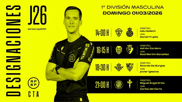 Actualidad Inicio Noticias Todas Categorías Institucional Expand Secondary Navigation Menu Presidencia Juntas directivas Igualdad Responsabilidad Social y Sostenibilidad Integridad Protección de la infancia Área médica Elecciones 2024 Federaciones Territoriales FIFA Patrocinadores rfef.es Museo Labor federativa Expand Secondary Navigation Menu Concursos Circulares Horarios Sanciones Mundial 2030 Competiciones masculinas Expand Secondary Navigation Menu Primera División Segunda División Primera Federación Segunda Federación Tercera Federación Copa del Rey Mapfre Supercopa Copa Federación Playoff de ascenso Competiciones UEFA Competiciones femeninas Expand Secondary Navigation Menu Primera División Femenina Primera Federación Iberdrola Segunda Federación FUTFEM Tercera Federación FUTFEM Copa de la Reina Iberdrola Supercopa Iberdrola Juveniles fútbol 11 Expand Secondary Navigation Menu División de Honor Juvenil Copa de Campeones Copa del Rey juvenil Youth League Selecciones autonómicas Expand Secondary Navigation Menu Copa de las Regiones de UEFA Femenino sub-16 Masculino sub-16 Femenino sub-14 Masculino sub-14 Femenino sub-12 Masculino sub-12 Fútbol sala Expand Secondary Navigation Menu Primera Masculina FS Primera FS Iberdrola Segunda Masculina FS Segunda Femenina FS Segunda B FS División de Honor Juvenil FS Copa de España Supercopa FS Supercopa Femenina FS Copa del Rey FS Copa de la Reina FS Copa de España Juvenil Campeonato de España Juvenil FS Futsal UEFA Champions League Selecciones autonómicas FS Otras competiciones Fútbol playa Expand Secondary Navigation Menu Primera División Playa Masc Segunda División Playa Masc Primera División Playa Fem Segunda División Playa Fem Copa Federación Playa Supercopa Playa Selecciones autonómicas Playa Campeonatos Clubes Base Playa Selecciones Playa adaptado Grassroots Expand Secondary Navigation Menu Playmakers Árbitros Expand Secondary Navigation Menu Designaciones VAR Expand Secondary Navigation Menu Audios VAR Entrenadores Expand Secondary Navigation Menu Premios Técnicos por el mundo Cursos Formación Expand Secondary Navigation Menu Formación online Formación presencial Selección Absoluta Selecciones Masculinas Expand Secondary Navigation Menu Sub-21 Sub-20 Sub-19 Sub-18 Sub-17 Sub-16 Sub-15 Sub-14 Selección Absoluta Femenina Selecciones Femeninas Expand Secondary Navigation Menu Sub-23 Sub-20 Femenina Sub-19 Femenina Sub-17 Femenina Sub-18 Femenina Sub-16 Femenina Sub-15 Femenina Sub-14 Femenina Selección Olímpica Expand Secondary Navigation Menu Selección Olímpica femenina Selección Olímpica masculina Selecciones fútbol sala masculinas Expand Secondary Navigation Menu Selección Absoluta fútbol sala Sub-23 fútbol sala Sub-21 fútbol sala Sub-18 fútbol sala Sub-19 fútbol sala Sub-17 fútbol sala Sub-16 fútbol sala Sub-15 fútbol sala Selecciones fútbol sala femeninas Expand Secondary Navigation Menu Selección Femenina fútbol sala Sub-23 Femenina fútbol sala Sub-21 Femenina fútbol sala Sub-19 Femenina fútbol sala Sub-18 Femenina fútbol sala Sub-17 Femenina fútbol sala Sub-15 Femenina fútbol sala Selecciones de fútbol playa Expand Secondary Navigation Menu Absoluta Masculina Playa Absoluta Femenina Playa Sub-21 Masculina Playa E-Sports Expand Secondary Navigation Menu e-Copa RFEF Leyendas Aplicar 57079 Resultados. Designaciones Designaciones | Estos son los árbitros de la final de la Copa Regiones UEFA DESIGNACIÓN ARBITRAL COMPLETA DE LA FINAL DE LA COPA REGIONES UEFA 28 Febrero 2026 Video en el interior Copa de las Regiones de UEFA El otro lado de la Copa de Regiones UEFA Detrás de cada jugador y cada Selección, la Regions' Cup guarda una historia única 28 Febrero 2026 Video en el interior Galería de imágenes en el interior Sub-20 Femenina La Selección Sub-20 supera con autoridad a Inglaterra (3-1) México, el 3 de marzo, y Países Bajos, el 6, serán los próximos rivales del conjunto David Aznar 28 Febrero 2026 Galería de imágenes en el interior Selección Absoluta Femenina Adiós a febrero con el trabajo hecho La Selección ha llevado a cabo este 28 de febrero en Las Rozas una larga e intensa sesión 28 Febrero 2026 Primera Federación, Horarios Horarios y televisiones de la jornada 29 de Primera Federación Versus e-Learning Consulta los horarios y televisiones de la vigesimonovena jornada que se disputará entre el viernes 20, el sábado 21 y el domingo 22 de marzo 28 Febrero 2026 Designaciones, Primera División, VAR Estos son los árbitros para los partidos del domingo 1 de marzo de la jornada 26 en Primera División DESIGNACIÓN ARBITRAL COMPLETA | PRIMERA DIVISIÓN | TEMPORADA 2025-2026 | JORNADA 26 | DOMINGO 1 DE MARZO 28 Febrero 2026 Designaciones, VAR, Segunda División Designaciones | Estos son los árbitros para los partidos del domingo 1 de marzo de la jornada 28 en Segunda División DESIGNACIÓN ARBITRAL COMPLETA | SEGUNDA DIVISIÓN | TEMPORADA 2025-2026 | JORNADA 28 | DOMINGO 1 DE MARZO 28 Febrero 2026 Video en el interior Segunda Masculina FS J21 PARTIDO | Entrerríos Automatización - Heredia 21 Málaga Ciudad Redonda Encuentro correspondiente a la 21ª Jornada de la Segunda División masculina 28 Febrero 2026 Video en el interior Segunda Femenina FS, Partidos completos J21 PARTIDO | CD San Pablo Eivis - Estrela Futsal CD SAN PABLO-EIVIS 1-8 ESTRELA FUTSAL 28 Febrero 2026 Galería de imágenes en el interior Selección Absoluta Femenina Celebradas con éxito las Jornadas Deportivas 'Igualdad en el Deporte y la Sociedad' en Castellón El Real Casino Antiguo de Castellón ha sido el escenario elegido para la celebración del evento 27 Febrero 2026 Galería de imágenes en el interior Copa de las Regiones de UEFA Canarias y Navarra, en la final de la fase nacional de la Copa de Regiones de la UEFA La final entre ambos conjuntos se disputará este domingo, 1 de marzo, a las 12:00 horas 27 Febrero 2026 Ver más Ver más