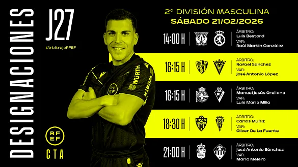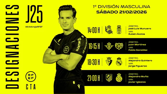 Actualidad Inicio Noticias Todas Categorías Institucional Expand Secondary Navigation Menu Presidencia Juntas directivas Igualdad Responsabilidad Social y Sostenibilidad Integridad Protección de la infancia Área médica Elecciones 2024 Federaciones Territoriales FIFA Patrocinadores rfef.es Museo Labor federativa Expand Secondary Navigation Menu Concursos Circulares Horarios Sanciones Mundial 2030 Competiciones masculinas Expand Secondary Navigation Menu Primera División Segunda División Primera Federación Segunda Federación Tercera Federación Copa del Rey Mapfre Supercopa Copa Federación Playoff de ascenso Competiciones UEFA Competiciones femeninas Expand Secondary Navigation Menu Primera División Femenina Primera Federación Iberdrola Segunda Federación FUTFEM Tercera Federación FUTFEM Copa de la Reina Iberdrola Supercopa Iberdrola Juveniles fútbol 11 Expand Secondary Navigation Menu División de Honor Juvenil Copa de Campeones Copa del Rey juvenil Youth League Selecciones autonómicas Expand Secondary Navigation Menu Copa de las Regiones de UEFA Femenino sub-16 Masculino sub-16 Femenino sub-14 Masculino sub-14 Femenino sub-12 Masculino sub-12 Fútbol sala Expand Secondary Navigation Menu Primera Masculina FS Primera FS Iberdrola Segunda Masculina FS Segunda Femenina FS Segunda B FS División de Honor Juvenil FS Copa de España Supercopa FS Supercopa Femenina FS Copa del Rey FS Copa de la Reina FS Copa de España Juvenil Campeonato de España Juvenil FS Futsal UEFA Champions League Selecciones autonómicas FS Otras competiciones Fútbol playa Expand Secondary Navigation Menu Primera División Playa Masc Segunda División Playa Masc Primera División Playa Fem Segunda División Playa Fem Copa Federación Playa Supercopa Playa Selecciones autonómicas Playa Campeonatos Clubes Base Playa Selecciones Playa adaptado Grassroots Expand Secondary Navigation Menu Playmakers Árbitros Expand Secondary Navigation Menu Designaciones VAR Expand Secondary Navigation Menu Audios VAR Entrenadores Expand Secondary Navigation Menu Premios Técnicos por el mundo Cursos Formación Expand Secondary Navigation Menu Formación online Formación presencial Selección Absoluta Selecciones Masculinas Expand Secondary Navigation Menu Sub-21 Sub-20 Sub-19 Sub-18 Sub-17 Sub-16 Sub-15 Sub-14 Selección Absoluta Femenina Selecciones Femeninas Expand Secondary Navigation Menu Sub-23 Sub-20 Femenina Sub-19 Femenina Sub-17 Femenina Sub-18 Femenina Sub-16 Femenina Sub-15 Femenina Sub-14 Femenina Selección Olímpica Expand Secondary Navigation Menu Selección Olímpica femenina Selección Olímpica masculina Selecciones fútbol sala masculinas Expand Secondary Navigation Menu Selección Absoluta fútbol sala Sub-23 fútbol sala Sub-21 fútbol sala Sub-18 fútbol sala Sub-19 fútbol sala Sub-17 fútbol sala Sub-16 fútbol sala Sub-15 fútbol sala Selecciones fútbol sala femeninas Expand Secondary Navigation Menu Selección Femenina fútbol sala Sub-23 Femenina fútbol sala Sub-21 Femenina fútbol sala Sub-19 Femenina fútbol sala Sub-18 Femenina fútbol sala Sub-17 Femenina fútbol sala Sub-15 Femenina fútbol sala Selecciones de fútbol playa Expand Secondary Navigation Menu Absoluta Masculina Playa Absoluta Femenina Playa Sub-21 Masculina Playa E-Sports Expand Secondary Navigation Menu e-Copa RFEF Leyendas Aplicar 57044 Resultados. Primera Federación Iberdrola PREVIA | Todo en juego La Jornada 20 de la Primera Federación Iberdrola arranca con encuentros que pueden definir el campeonato 20 Febrero 2026 Primera Federación César Palacios irrumpe con fuerza en el top 5 La carrera por el ‘Pichichi’ se aprieta con la inesperada irrupción del madridista César Palacios en la zona alta de la tabla. 20 Febrero 2026 Futsal UEFA Champions League, Primera Masculina FS PREVIA | Un paso más hacia la Final Four europea Comienzan los cuartos de final de la UEFA Futsal Champions League con el Jimbee Cartagena Costa Cálida y el Illes Balears Palma Futsal como principales favoritos en sus cruces 20 Febrero 2026 Primera Federación PREVIA | Derbis de honor La vigesimoquinta entrega de Primera Federación Versus e-Learning llega cargada de partidos de altura. 20 Febrero 2026 Video en el interior Sub-16 Ikenna Lionel Ikezu, una mezcla perfecta para España Este rápido extremo, que debuta esta semana con España, nació en Suiza, su padre es de Nigeria y brilla en el FC Zürich 20 Febrero 2026 Galería de imágenes en el interior Selección Absoluta Femenina Sonia Bermúdez: "Comenzamos un nuevo camino" La seleccionadora nacional ha comparecido en La Ciudad del Fútbol de Las Rozas tras hacer oficial la lista de convocadas para los partidos frente a Islandia y Ucrania 20 Febrero 2026 Designaciones, Primera División, VAR Estos son los árbitros para los partidos del sábado 21 de febrero de la jornada 25 en Primera División DESIGNACIÓN ARBITRAL COMPLETA | PRIMERA DIVISIÓN | TEMPORADA 2025-2026 | JORNADA 25 | SÁBADO 21 DE FEBRERO 20 Febrero 2026 Designaciones, VAR, Segunda División Designaciones | Estos son los árbitros para los partidos del sábado 21 de febrero de la jornada 27 en Segunda División DESIGNACIÓN ARBITRAL COMPLETA | SEGUNDA DIVISIÓN | TEMPORADA 2025-2026 | JORNADA 27 | SÁBADO 21 DE FEBRERO 20 Febrero 2026 Video en el interior Selección Absoluta Femenina Esta es la lista de convocadas por Sonia Bermúdez para los partidos ante Islandia y Ucrania Estas 25 internacionales lucharán por sumar los primeros seis puntos en la fase de clasificación para el Mundial de Brasil 20 Febrero 2026 Primera Masculina FS PREVIA | Acabar con lo empezado en Primera División RTVE Play retransmitirá en directo el duelo entre el Noia Portus Apostoli y ElPozo Murcia Costa Cálida el próximo sábado, 21 de febrero, a las 13:00 horas 20 Febrero 2026 Segunda Masculina FS PREVIA | La Segunda División alcanza la veintena El enfrentamiento entre el Vulcanizados Ruiz Tafa y Gasifred Atlético Ibiza podrá seguirse en d