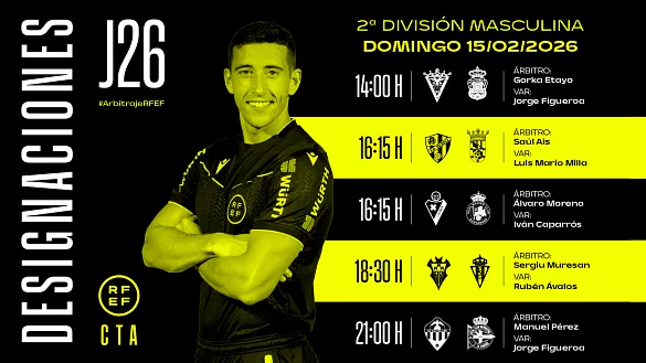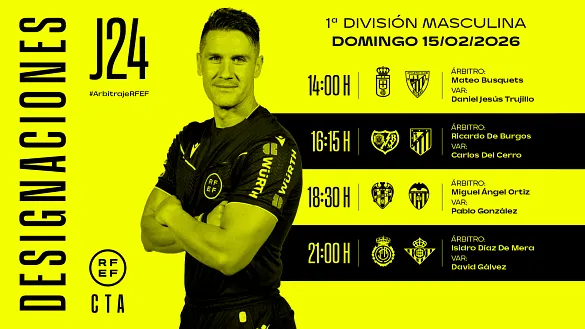 Actualidad Inicio Noticias Todas Categorías Institucional Expand Secondary Navigation Menu Presidencia Juntas directivas Igualdad Responsabilidad Social y Sostenibilidad Integridad Protección de la infancia Área médica Elecciones 2024 Federaciones Territoriales FIFA Patrocinadores rfef.es Museo Labor federativa Expand Secondary Navigation Menu Concursos Circulares Horarios Sanciones Mundial 2030 Competiciones masculinas Expand Secondary Navigation Menu Primera División Segunda División Primera Federación Segunda Federación Tercera Federación Copa del Rey Mapfre Supercopa Copa Federación Playoff de ascenso Competiciones UEFA Competiciones femeninas Expand Secondary Navigation Menu Primera División Femenina Primera Federación Iberdrola Segunda Federación FUTFEM Tercera Federación FUTFEM Copa de la Reina Iberdrola Supercopa Iberdrola Juveniles fútbol 11 Expand Secondary Navigation Menu División de Honor Juvenil Copa de Campeones Copa del Rey juvenil Youth League Selecciones autonómicas Expand Secondary Navigation Menu Copa de las Regiones de UEFA Femenino sub-16 Masculino sub-16 Femenino sub-14 Masculino sub-14 Femenino sub-12 Masculino sub-12 Fútbol sala Expand Secondary Navigation Menu Primera Masculina FS Primera FS Iberdrola Segunda Masculina FS Segunda Femenina FS Segunda B FS División de Honor Juvenil FS Copa de España Supercopa FS Supercopa Femenina FS Copa del Rey FS Copa de la Reina FS Copa de España Juvenil Campeonato de España Juvenil FS Futsal UEFA Champions League Selecciones autonómicas FS Otras competiciones Fútbol playa Expand Secondary Navigation Menu Primera División Playa Masc Segunda División Playa Masc Primera División Playa Fem Segunda División Playa Fem Copa Federación Playa Supercopa Playa Selecciones autonómicas Playa Campeonatos Clubes Base Playa Selecciones Playa adaptado Grassroots Expand Secondary Navigation Menu Playmakers Árbitros Expand Secondary Navigation Menu Designaciones VAR Expand Secondary Navigation Menu Audios VAR Entrenadores Expand Secondary Navigation Menu Premios Técnicos por el mundo Cursos Formación Expand Secondary Navigation Menu Formación online Formación presencial Selección Absoluta Selecciones Masculinas Expand Secondary Navigation Menu Sub-21 Sub-20 Sub-19 Sub-18 Sub-17 Sub-16 Sub-15 Sub-14 Selección Absoluta Femenina Selecciones Femeninas Expand Secondary Navigation Menu Sub-23 Sub-20 Femenina Sub-19 Femenina Sub-17 Femenina Sub-18 Femenina Sub-16 Femenina Sub-15 Femenina Sub-14 Femenina Selección Olímpica Expand Secondary Navigation Menu Selección Olímpica femenina Selección Olímpica masculina Selecciones fútbol sala masculinas Expand Secondary Navigation Menu Selección Absoluta fútbol sala Sub-23 fútbol sala Sub-21 fútbol sala Sub-18 fútbol sala Sub-19 fútbol sala Sub-17 fútbol sala Sub-16 fútbol sala Sub-15 fútbol sala Selecciones fútbol sala femeninas Expand Secondary Navigation Menu Selección Femenina fútbol sala Sub-23 Femenina fútbol sala Sub-21 Femenina fútbol sala Sub-19 Femenina fútbol sala Sub-18 Femenina fútbol sala Sub-17 Femenina fútbol sala Sub-15 Femenina fútbol sala Selecciones de fútbol playa Expand Secondary Navigation Menu Absoluta Masculina Playa Absoluta Femenina Playa Sub-21 Masculina Playa E-Sports Expand Secondary Navigation Menu e-Copa RFEF Leyendas Aplicar 57051 Resultados. Designaciones, VAR, Segunda División Designaciones | Cambio del árbitro principal del partido SD Eibar - Real Racing Club por baja médica El Comité Arbitral de la Competición Profesional ha modificado la designación del árbitro principal del encuentro SD Eibar - Real Racing Club de la jornada 26 de Segunda División por baja médica.De... 15 Febrero 2026 Video en el interior Primera FS Iberdrola RESÚMENES | Al detalle la 18ª jornada de Primera FS Iberdrola Todos los encuentros y los mejores resúmenes de la 18ª jornada, ¡A golpe de click! 15 Febrero 2026 Primera FS Iberdrola Cambios en la Primera FS Iberdrola por San Valentín No decepcionó el partidazo de la jornada en la Primera FS Iberdrola. El Melilla CD Torreblanca se hizo con el botín de los puntos en A Seca con dos solitarios goles de Irene Samper y de Silvina, que... 15 Febrero 2026 Video en el interior Audios VAR, Primera División Audios de las revisiones VAR de la 24ª jornada en Primera División de la temporada 2025/26 Estos audios se publicarán durante cada jornada de Primera y Segunda División de la temporada 2025/2026 14 Febrero 2026 Primera FS Iberdrola El Melilla CD Torreblanca vuelve al liderato POIO PESCAMAR 0-2 MELILLA CD TORREBLANCA | FICHA TÉCNICA DEL PARTIDOInicio dominador de Melilla, que a los dos minutos de juego conseguía estrenar el marcador. Irene Samper culminaba una buena... 14 Febrero 2026 Segunda Masculina FS El Wanapix se enamora del liderato Los aragoneses aguantan la primera posición de la Segunda División y amplían su ventaja a seis puntos debido a la suspensión del partido de su perseguidor, el Inagroup El Ejido 14 Febrero 2026 Video en el interior Segunda Femenina FS, Partidos completos J19 PARTIDO | Salesianos Puertollano - Torrejón Sala SALESIANOS PUERTOLLANO 5– 3 TORREJÓN SALA FIVE PLAY 14 Febrero 2026 Video en el interior Segunda Femenina FS, Partidos completos J19 PARTIDO | Teldeportivo - River Zamora GRAN CANARIA TELDEPORTIVO 2–0 CAJA RURAL RIVER ZAMORA 14 Febrero 2026 Designaciones, Primera División, VAR Estos son los árbitros para los partidos del domingo 15 de febrero de la jornada 24 en Primera División DESIGNACIÓN ARBITRAL COMPLETA | PRIMERA DIVISIÓN | TEMPORADA 2025-2026 | JORNADA 24 | DOMINGO 15 DE FEBRERO 14 Febrero 2026 Designaciones, VAR, Segunda División Designaciones | Estos son los árbitros para los partidos del domingo 15 de febrero de la jornada 26 en Segunda División DESIGNACIÓN ARBITRAL COMPLETA | SEGUNDA DIVISIÓN | TEMPORADA 2025-2026 | JORNADA 26 | DOMINGO 15 DE FEBRERO 14 Febrero 2026 Video en el interior Segunda Masculina FS J