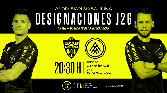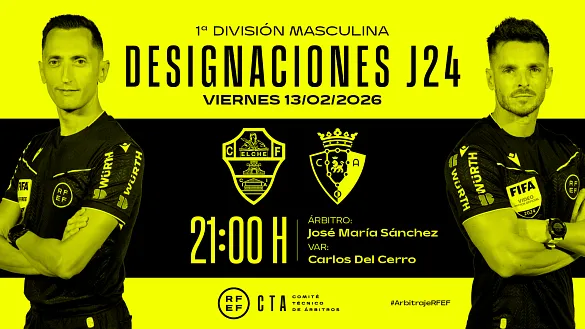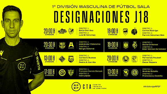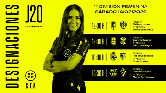 Actualidad Inicio Noticias Todas Categorías Institucional Expand Secondary Navigation Menu Presidencia Juntas directivas Igualdad Responsabilidad Social y Sostenibilidad Integridad Protección de la infancia Área médica Elecciones 2024 Federaciones Territoriales FIFA Patrocinadores rfef.es Museo Labor federativa Expand Secondary Navigation Menu Concursos Circulares Horarios Sanciones Mundial 2030 Competiciones masculinas Expand Secondary Navigation Menu Primera División Segunda División Primera Federación Segunda Federación Tercera Federación Copa del Rey Mapfre Supercopa Copa Federación Playoff de ascenso Competiciones UEFA Competiciones femeninas Expand Secondary Navigation Menu Primera División Femenina Primera Federación Iberdrola Segunda Federación FUTFEM Tercera Federación FUTFEM Copa de la Reina Iberdrola Supercopa Iberdrola Juveniles fútbol 11 Expand Secondary Navigation Menu División de Honor Juvenil Copa de Campeones Copa del Rey juvenil Youth League Selecciones autonómicas Expand Secondary Navigation Menu Copa de las Regiones de UEFA Femenino sub-16 Masculino sub-16 Femenino sub-14 Masculino sub-14 Femenino sub-12 Masculino sub-12 Fútbol sala Expand Secondary Navigation Menu Primera Masculina FS Primera FS Iberdrola Segunda Masculina FS Segunda Femenina FS Segunda B FS División de Honor Juvenil FS Copa de España Supercopa FS Supercopa Femenina FS Copa del Rey FS Copa de la Reina FS Copa de España Juvenil Campeonato de España Juvenil FS Futsal UEFA Champions League Selecciones autonómicas FS Otras competiciones Fútbol playa Expand Secondary Navigation Menu Primera División Playa Masc Segunda División Playa Masc Primera División Playa Fem Segunda División Playa Fem Copa Federación Playa Supercopa Playa Selecciones autonómicas Playa Campeonatos Clubes Base Playa Selecciones Playa adaptado Grassroots Expand Secondary Navigation Menu Playmakers Árbitros Expand Secondary Navigation Menu Designaciones VAR Expand Secondary Navigation Menu Audios VAR Entrenadores Expand Secondary Navigation Menu Premios Técnicos por el mundo Cursos Formación Expand Secondary Navigation Menu Formación online Formación presencial Selección Absoluta Selecciones Masculinas Expand Secondary Navigation Menu Sub-21 Sub-20 Sub-19 Sub-18 Sub-17 Sub-16 Sub-15 Sub-14 Selección Absoluta Femenina Selecciones Femeninas Expand Secondary Navigation Menu Sub-23 Sub-20 Femenina Sub-19 Femenina Sub-17 Femenina Sub-18 Femenina Sub-16 Femenina Sub-15 Femenina Sub-14 Femenina Selección Olímpica Expand Secondary Navigation Menu Selección Olímpica femenina Selección Olímpica masculina Selecciones fútbol sala masculinas Expand Secondary Navigation Menu Selección Absoluta fútbol sala Sub-23 fútbol sala Sub-21 fútbol sala Sub-18 fútbol sala Sub-19 fútbol sala Sub-17 fútbol sala Sub-16 fútbol sala Sub-15 fútbol sala Selecciones fútbol sala femeninas Expand Secondary Navigation Menu Selección Femenina fútbol sala Sub-23 Femenina fútbol sala Sub-21 Femenina fútbol sala Sub-19 Femenina fútbol sala Sub-18 Femenina fútbol sala Sub-17 Femenina fútbol sala Sub-15 Femenina fútbol sala Selecciones de fútbol playa Expand Secondary Navigation Menu Absoluta Masculina Playa Absoluta Femenina Playa Sub-21 Masculina Playa E-Sports Expand Secondary Navigation Menu e-Copa RFEF Leyendas Aplicar 57051 Resultados. Primera Federación Recuperar sensaciones La Jornada 23 de Primera Federación Versus e-Learning alberga encuentros para volver a sonreír como son el CD Tenerife-Racing de Ferrol y el UD Ibiza-CE Sabadell. 12 Febrero 2026 Designaciones, Primera Federación Iberdrola Designaciones | Estas son las árbitras de la jornada 19 en Primera Federación femenina DESIGNACIÓN ARBITRAL COMPLETA DE LA JORNADA 19 DE PRIMERA FEDERACIÓN FEMENINA 12 Febrero 2026 Designaciones, Primera División Femenina Designaciones | Estas son las árbitras de la jornada 20 en Primera División femenina DESIGNACIÓN ARBITRAL COMPLETA DE LA JORNADA 20 EN PRIMERA DIVISIÓN FEMENINA 12 Febrero 2026 Designaciones, VAR, Segunda División Designaciones | Estos son los árbitros para el partido del viernes 13 de febrero de la jornada 26 en Segunda División DESIGNACIÓN ARBITRAL COMPLETA DEL PARTIDO DEL VIERNES 13 DE FEBRERO EN SEGUNDA DIVISIÓN 12 Febrero 2026 Primera Federación Tiranía en el Reina Sofia Unionistas de Salamanca CF blinda su casa para asaltar definitivamente los puestos de ascenso 12 Febrero 2026 Designaciones, Primera División, VAR Designaciones | Estos son los árbitros para el partido del viernes 13 de febrero de la jornada 24 en Primera División DESIGNACIÓN ARBITRAL COMPLETA DEL PARTIDO DEL VIERNES 13 DE FEBERRO EN PRIMERA DIVISIÓN 12 Febrero 2026 Designaciones, Segunda Federación DESIGNACIONES | Definidos los árbitros que dirigirán la vigesimotercera jornada de la temporada 2025/26 Los 90 equipos de Segunda Federación jugarán entre el sábado 14 y el domingo 15 de febrero 12 Febrero 2026 Primera Federación, Designaciones DESIGNACIONES | Definidos los árbitros que dirigirán la vigesimocuarta jornada de la temporada 2025/26 La vigesimocuarta jornada se disputará entre el viernes 13, el sábado 14 y el domingo 15 de febrero 12 Febrero 2026 Primera Federación El Ibiza-Sabadell será retransmitido en Teledeporte El duelo entre celestes y arlequinados podrá disfrutarse en directo y en abierto. 12 Febrero 2026 Designaciones, Primera Masculina FS DESIGNACIONES | Estos son los árbitros de la jornada 18 en Primera División de fútbol sala Los encuentros de la 18ª jornada se disputarán el viernes 13, sábado 14 y domingo 15 de febrero 12 Febrero 2026 Segunda Masculina FS Gasifred Atlético Ibiza - Málaga Ciudad Redonda, objetivo playoffs El encuentro podrá seguirse en el canal de YouTube de la RFEF (sábado 14 de febrero, 18:00h) 12 Febrero 2026 Ver más Ver más